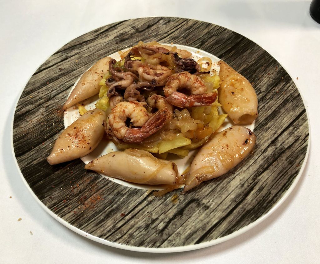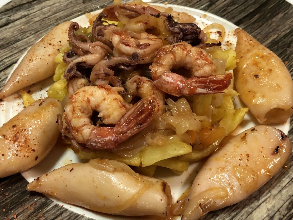Más pescado con los chipirones y langostinos a la plancha y patatas a lo pobre.