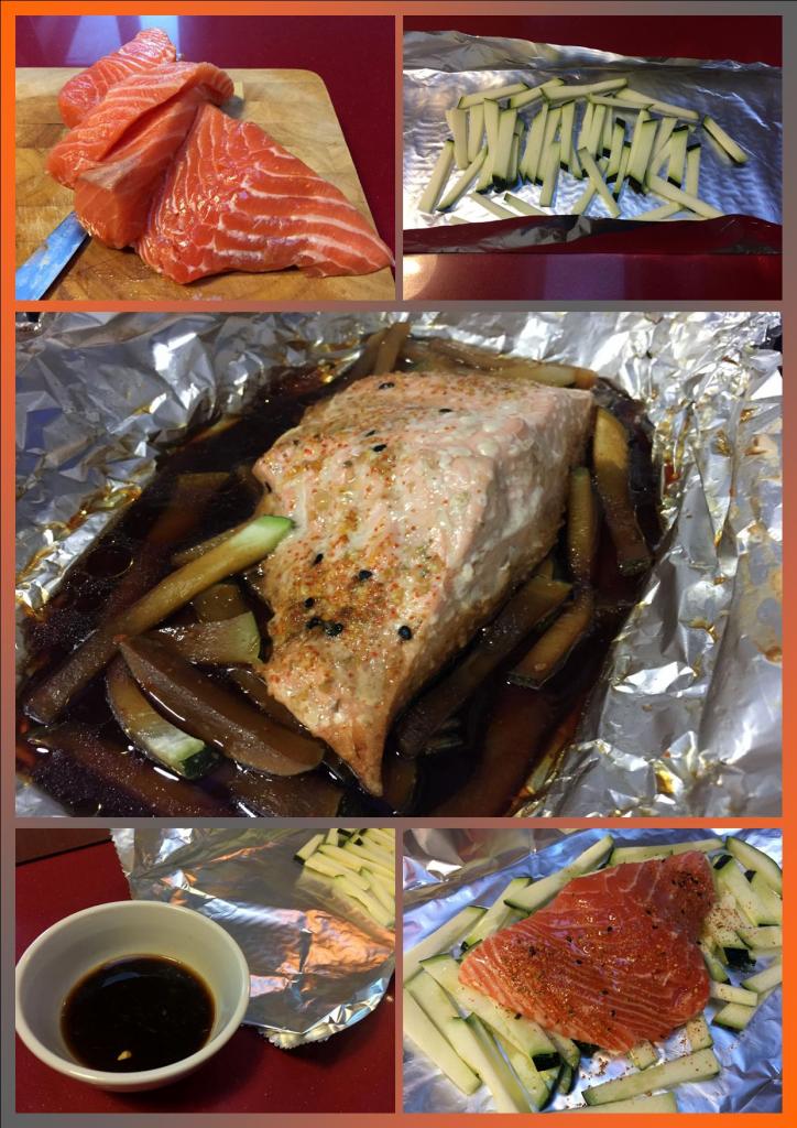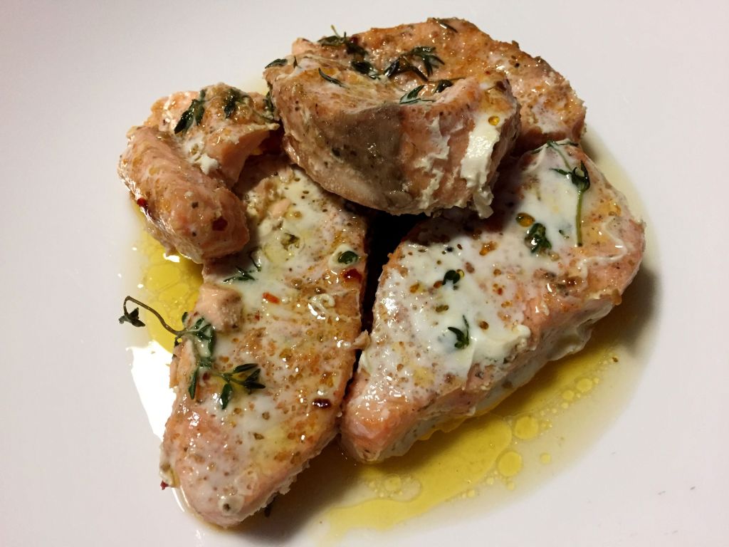 Uno de mis pescados favoritos para esta técnica es el salmón, porque tiene infiltraciones grasas y queda muy jugoso. Cuando fui a la pescadería, quería hacerme con una cola para sacar dos lomos iguales pero me tuve que conformar con parte de la cola y una rodaja así que opté por aportarles sabores diferentes.