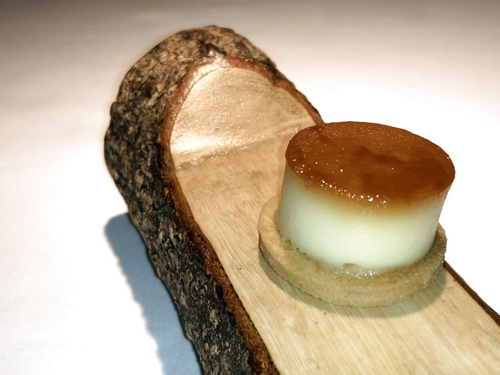 Helado de polen, eucalipto, yogur de leche de oveja y mandarina. Este postre se completa en mesa rociando con un poco de miel y hace del conjunto uno de esos postres para enmarcar. El merengue simulando un panal, el helado de polen, el granizado de gewürztraminer y eucalipto, el lacteo del yogur en la base y las perlas de cítricos ponían un listón muy alto para la siguiente elaboración.