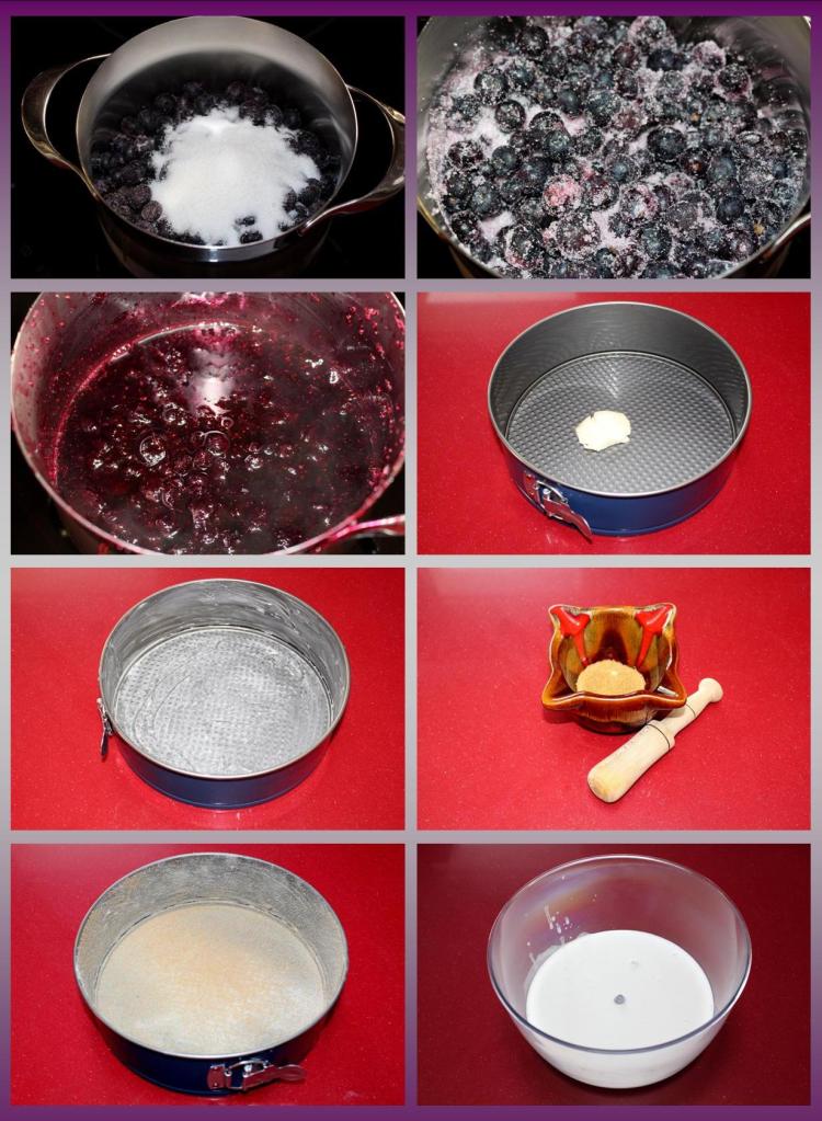 Ahora nos ponemos con la mermelada de arándanos. En una cacerola pondremos unos 300grs de arándanos con unos 50grs de azúcar, a fuego medio-fuerte dejamos que poco a poco se haga, suelten su agua, se mezclan con el azúcar, cuando reblandezcan aplastamos con una cuchara. Enfriamos a temperatura ambiente.