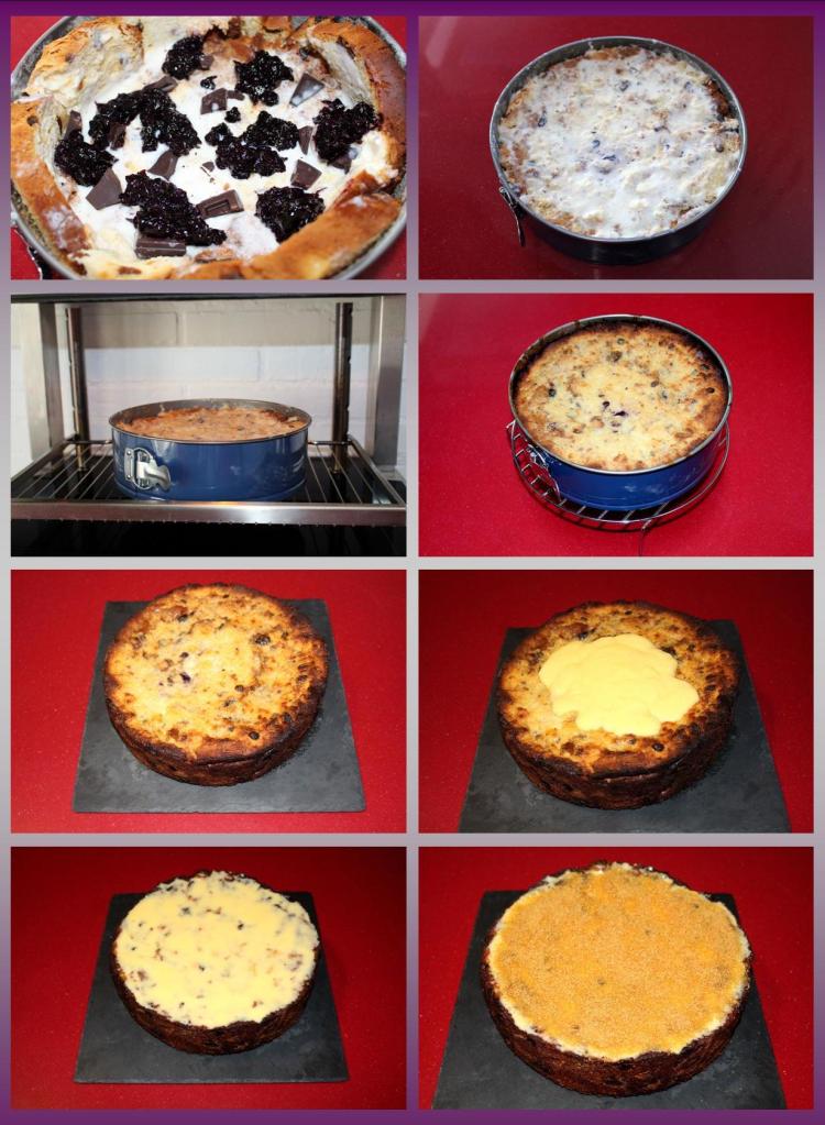 Partiendo de una rodaja en el centro del molde, las otras las doblamos para que suban por la pared del molde y si nos queda algún hueco lo rellenamos sin más cortando un trozo, vertemos una parte del líquido para que de vaya empapando pero sin que quede muy encharcado, ayudaremos con los dedos a que penetre. Ahora distribuimos unos trozos no muy grandes de chocolate que alternaremos con unas cucharaditas de mermelada de arándanos. Repetimos el proceso con otra capa hasta alcanzar el grueso del molde.