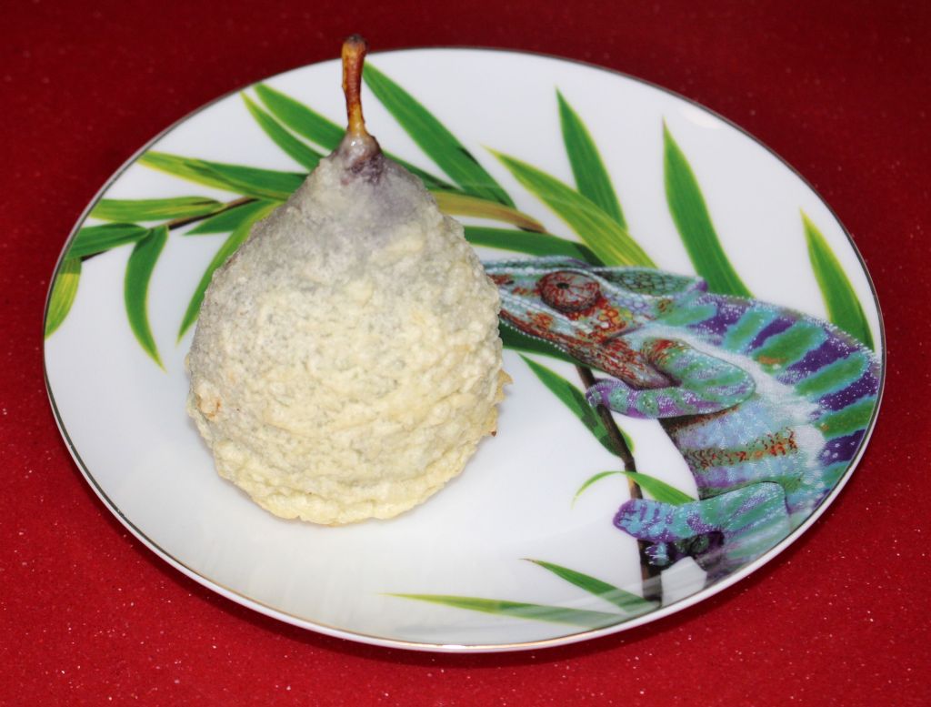 Haberla metido sin más hubiese sido muy obvio porque lo que buscaba era que se fundiese y saliera líquido, como los coulant de chocolate. La única alternativa era aplicar temperatura y de ahí parte hacerlas en tempura. Una pera en crudo no quedaría muy bien, al menos eso pienso yo, así que llegamos al origen, la base de una cocina tradicional, las peras al vino de toda la vida.