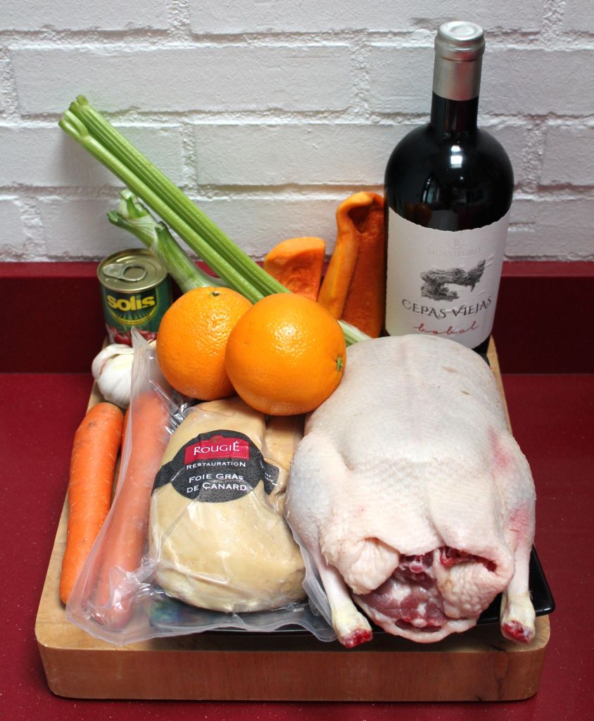 Para el caldo y guiso: 1 pato, 3 cebolletas, 3 ramas de apio, 3 ajos puerros, 3 zanahorias, 5 dientes de ajo, 1 calabaza, 2 naranjas, 1 vaso de vino, 2 vasos de caldo de pato, romero, laurel, tomillo, 5 bolitas de pimienta de Jamaica, 2 cdas. de concentrado de tomate, 2 cdas. de harina, agua y sal.