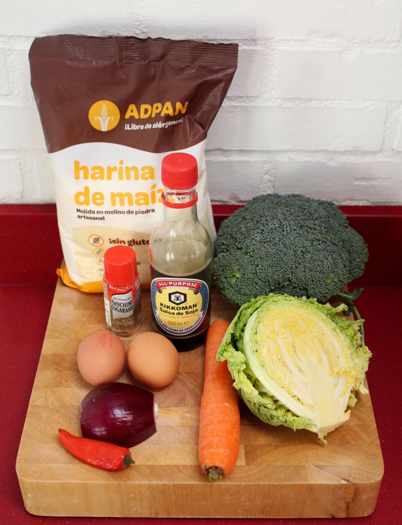 1/2 repollo, 1 árbol grande de brócoli, 1/2 cebolla morada, 1 zanahoria, 1 chile jalapeño, 100grs de calamar, 5cl de salsa de soja, 2 huevos, 100grs de harina de maíz, AOVE, sal y shichimi togarashi.
