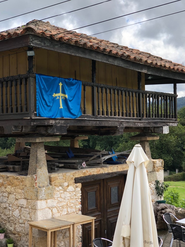 Hubo suerte y tras el cierre vacacional nos plantamos en Casa Evarista. Qué mejor sitio, a un paso de la ciudad, pero en contacto con la naturaleza para escanciar unas botellas de sidra con ese hórreo engalanado con nuestra bandera.