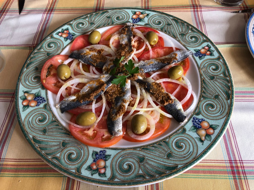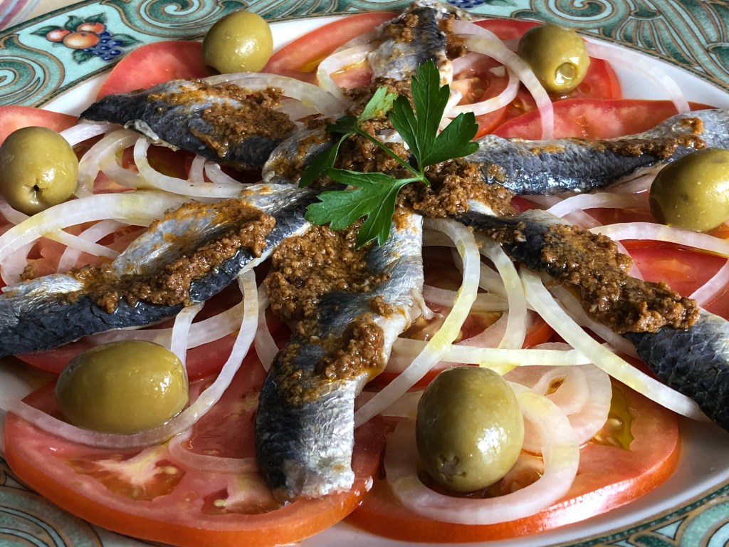 Como entrantes una magnífica ensalada de sardina marinada con mousse de tomate y aceituna. Le siguen unas fresquísimas parrochas con jamón.