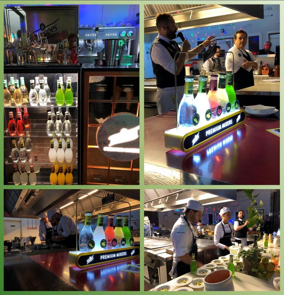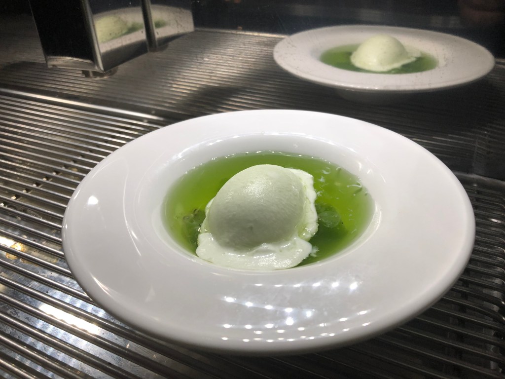 Para cerrar la noche nos quisieron sorprender, y lo hicieron con el Oximoron Vs Schweppes Té Matcha. Aquí dieron la vuelta de tuerca haciendo un cocktail gastronómico con queso Gamoneu, si, si, no me he confundido. Por un lado se hizo una extracción alcoholica de vodka y otra con agua para crear un sirope, en nariz resultó como un puñetazo, una copa estrecha habría ayudado pero si vamos al sabor y pensamos en el queso como postre, estaba rico pero difícil de disociar del fuerte olor.