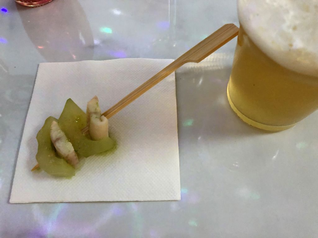 El siguiente pase se llamó Ahumados Vs Schweppes limón, una banderilla de anguila y pepino junto con salmón, manzana y café que fueron maridados con el cocktail Golden Beer Pint, una recreación de una clásica pinta de cerveza, que en realidad era un whisky sour con manzana y toque de ginger ale. No soy nada amigo de los escoceses y lo que en principio no me gustó (por el whisky), al maridar se vino muy arriba.