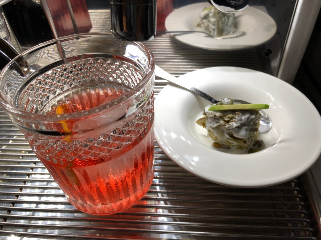 Delicadeza Vs Schweppes hibiscus. Un clásico revisado como fue este Negroni Rossastro para el que se utilizó una ginebra rosa, tan de moda, vermouth, Campari y la tonica de hibiscus que se acompañaron de un sämm de merluza en verde y un cogollo a la crema.