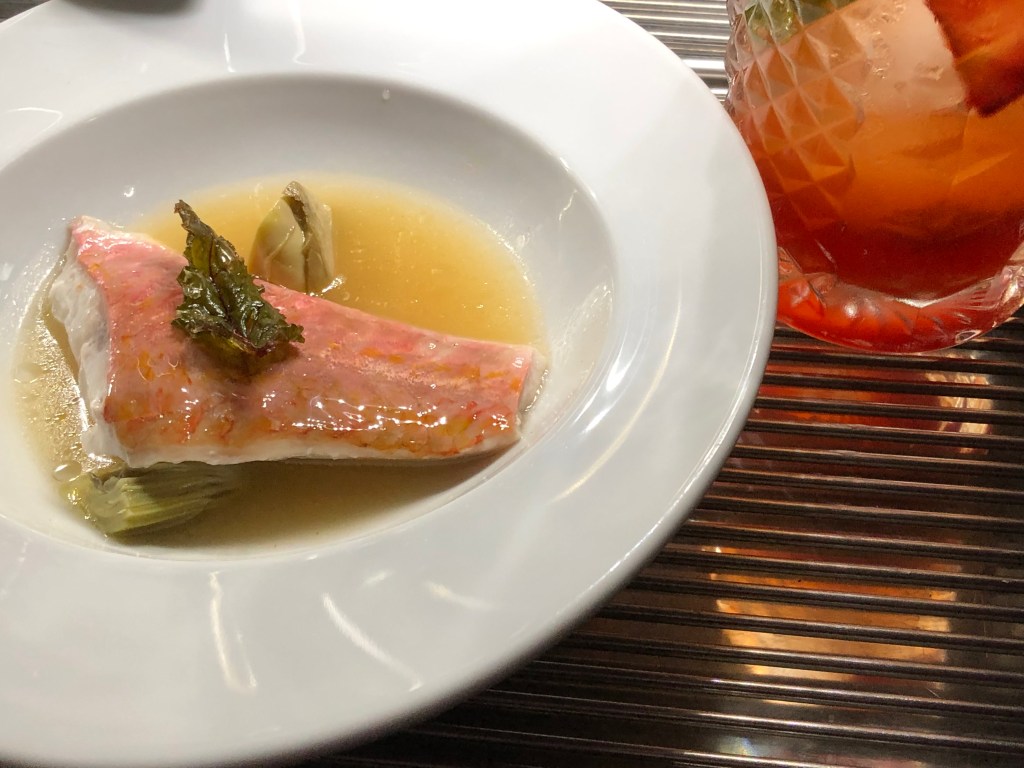 Para el siguiente envite llamado Cantábrico Vs Schweppes Ginge Ale / Jengibre intenso nos dieron un respiro con un cocktail llamado Baby Jane basado en el conocido Shirley Temple, sin alcohol. No por ello dejó indiferente, con ese toque amargo de la angostura y el picante del tabasco que resaltaron el buñuelo de salmonete y el salmonete con su consomé.