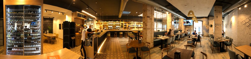 El local es sencillamente espectacular, una zona muy amplia de barra con mesas altas, unos pinchos XL y una decoración super agradable que llama la atención por sus grandes lámparas esféricas y un techo que parece salido de un teatro. La cocina vista es enorme, pegado un comedor con cierta privacidad, una vinoteca gigante y otra sala de comedor con una decoración tipo rústica pero muy luminosa.