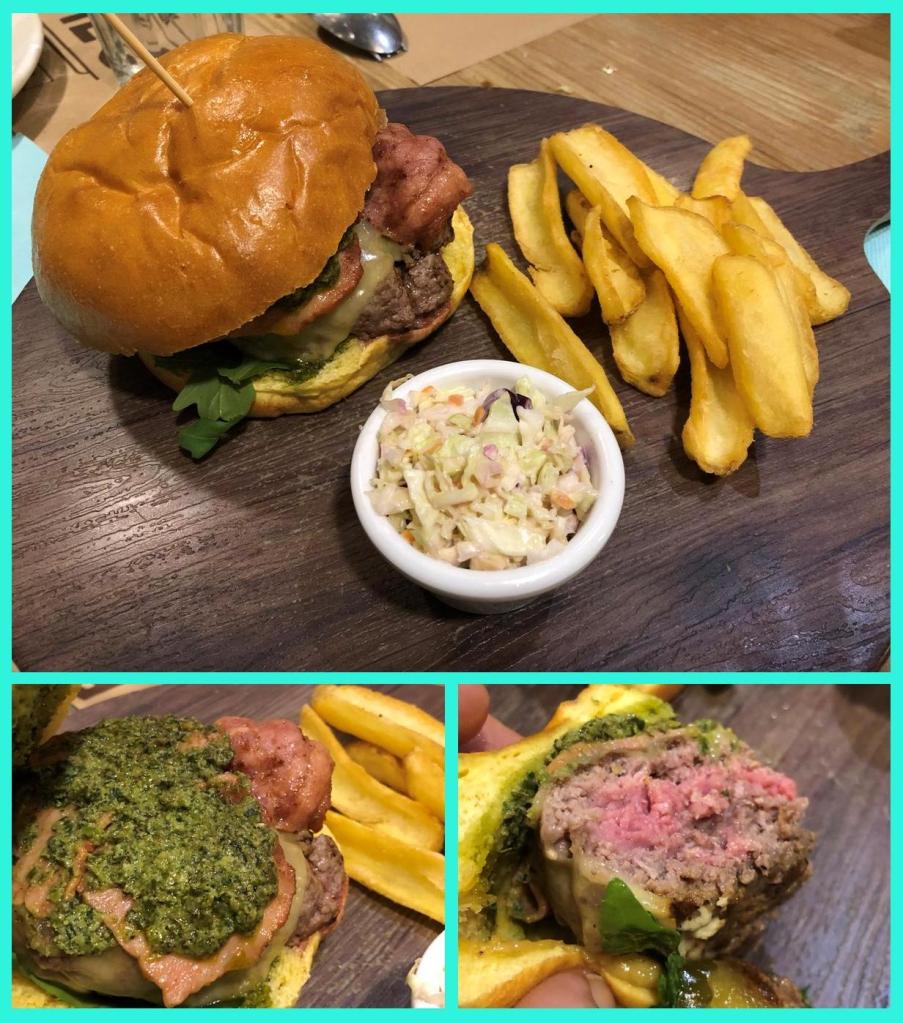 Genovesa: Angus 200grs, queso Monterey Jack, pepinillo, rúcula, bacon y pesto verde.