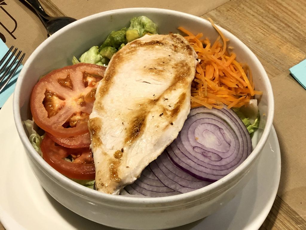 Bowls de Pollo o Burger: lechuga, tomate, cebolla morada, zanahoria rallada, rúcula y aguacate. El pollo puede ser planta o empanado.