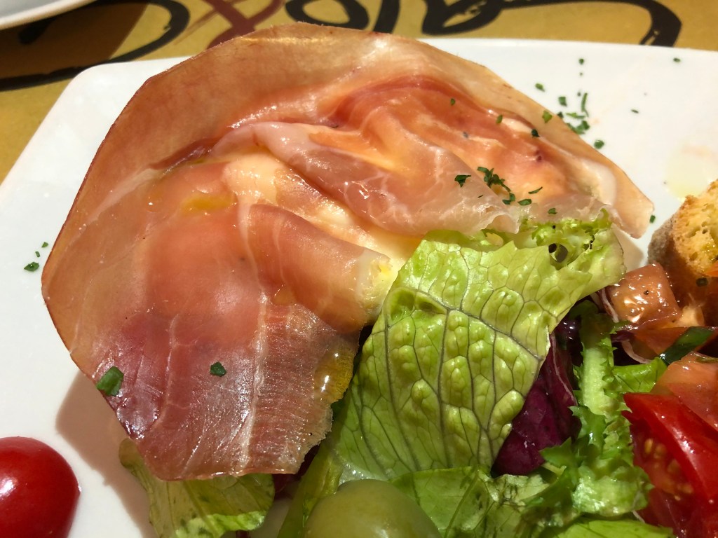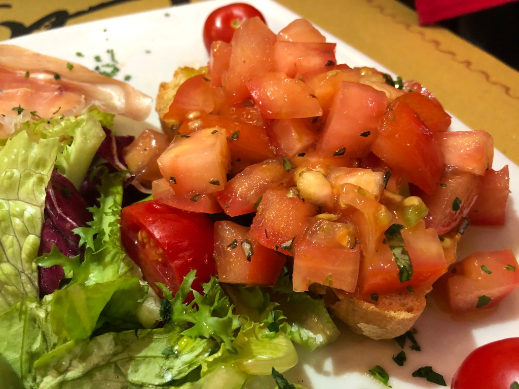 Como entrante elegimos el tris de bruschette, unas tostas de tomate natural, jamón de Parma con mozzarella y achicoria salteada con ajo y guindilla sobre queso stracchino.