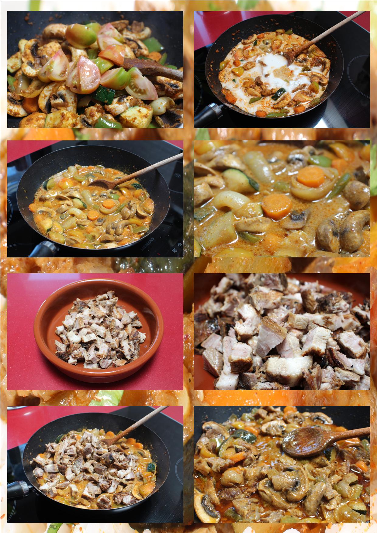 Cuando este a medio pochar, añadimos la leche de coco y dejamos al chup chup para que reduzca, transcurridos unos 15 minutos añadimos los trozos de costilla que habremos deshuesado y cortado mientras se hacen las verduras. En otros 10-15 minutos vuestro curry está listo para servir.