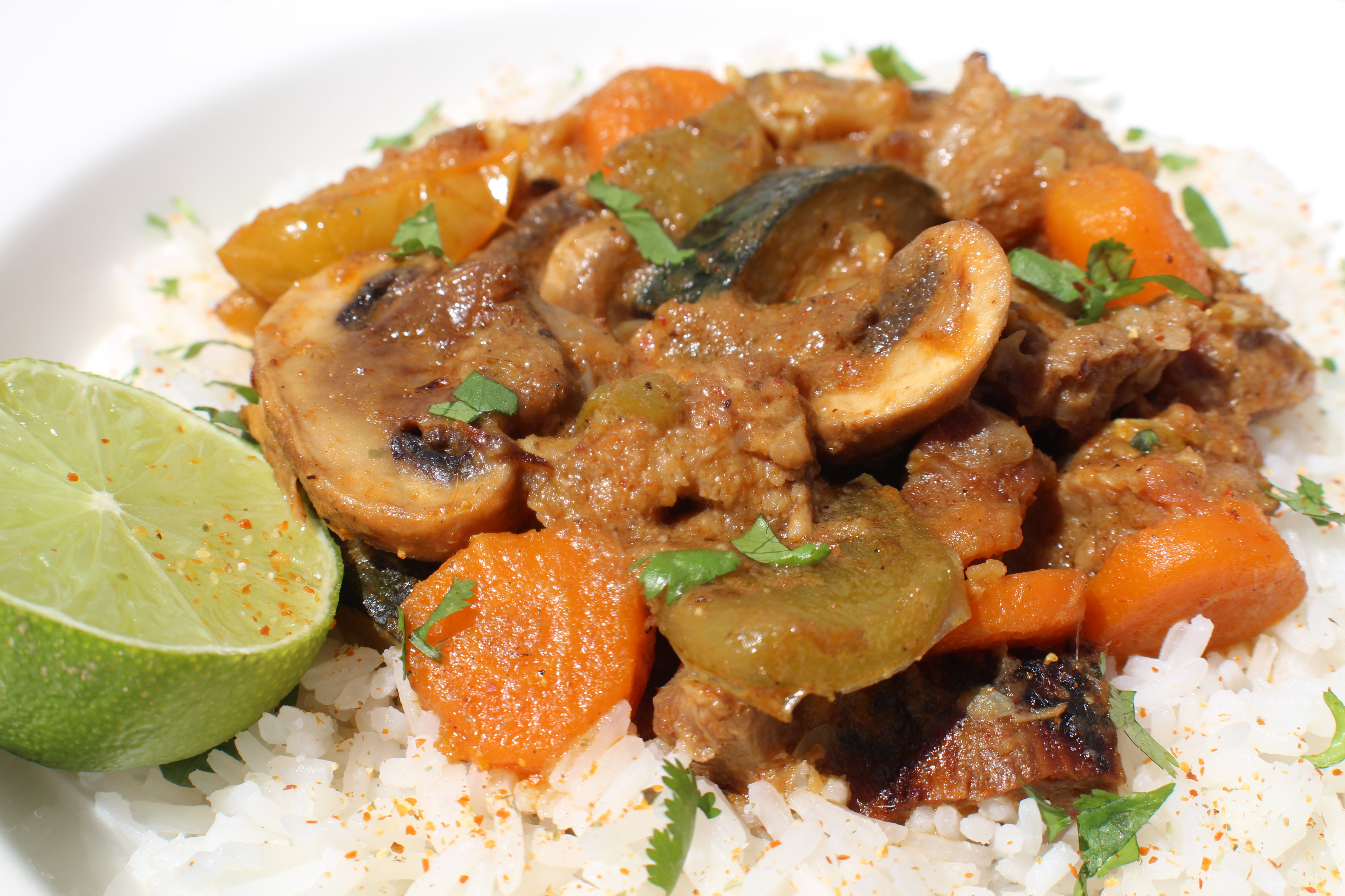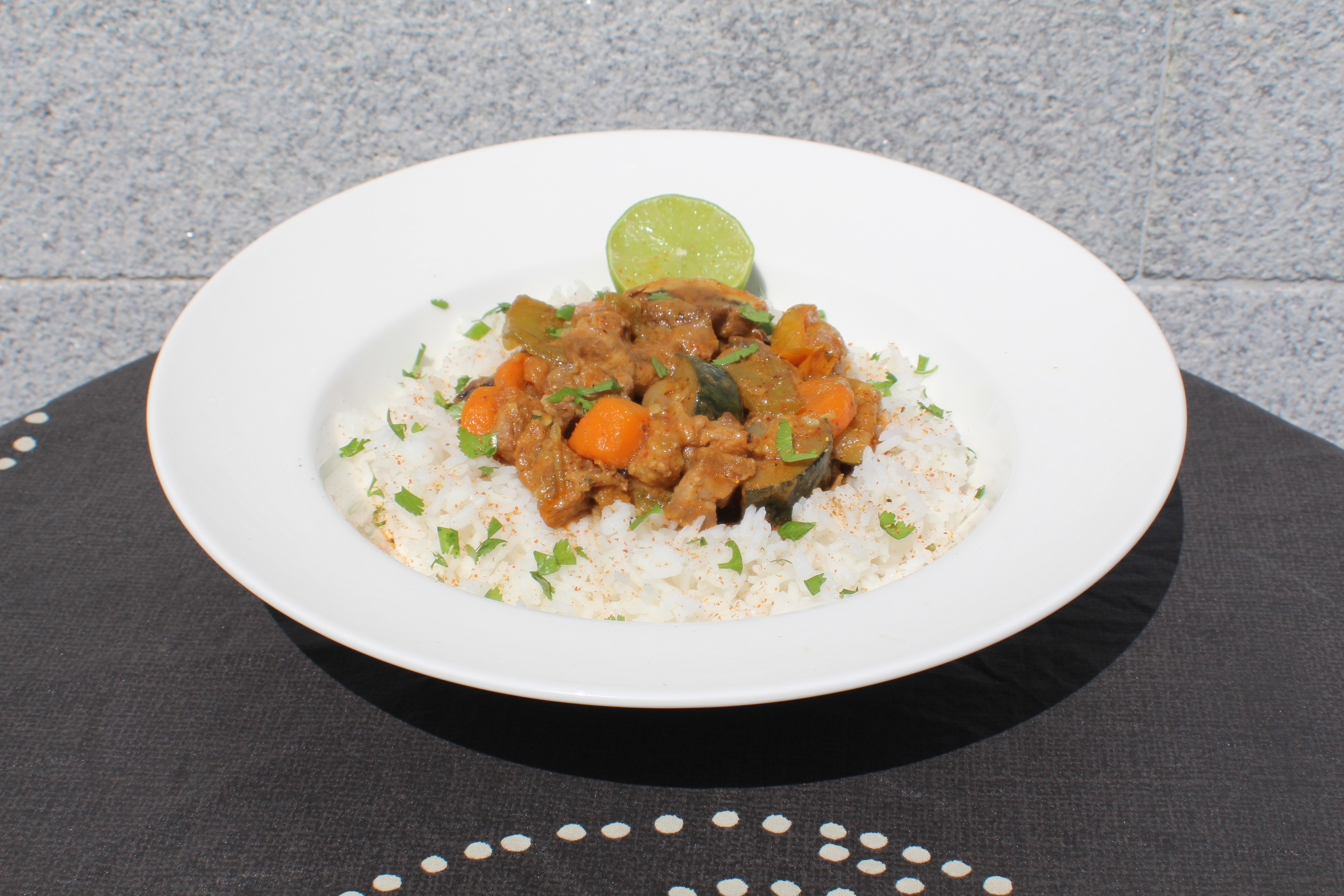 Costilla de cerdo, 1/2 calabacín grande, 8 cebollitas francesas, 10 champiñones naturales, jengibre, 2 tomates pequeños, 2 zanahorias, 1 pimiento verde, 3 cucharadas soperas de pasta de curry rojo, 220ml de leche de coco, arroz tipo jazmín, cilantro, aceite de oliva virgen extra, sal y shichimi togarashi.