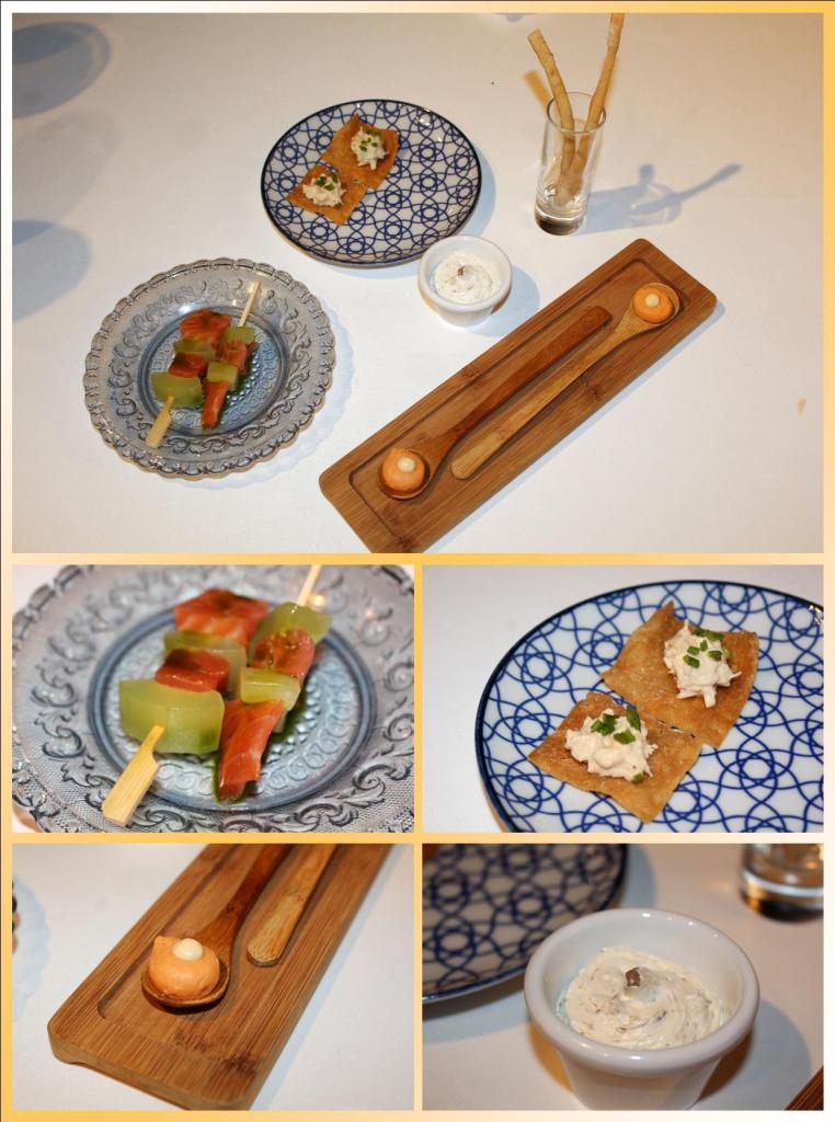 Nos ofrecen unos snacks entre los que encontramos un salmón marinado con pepino, un pastel de pescado, una mantequilla de anchoas y otro que no recuerdo (cosas de la edad).