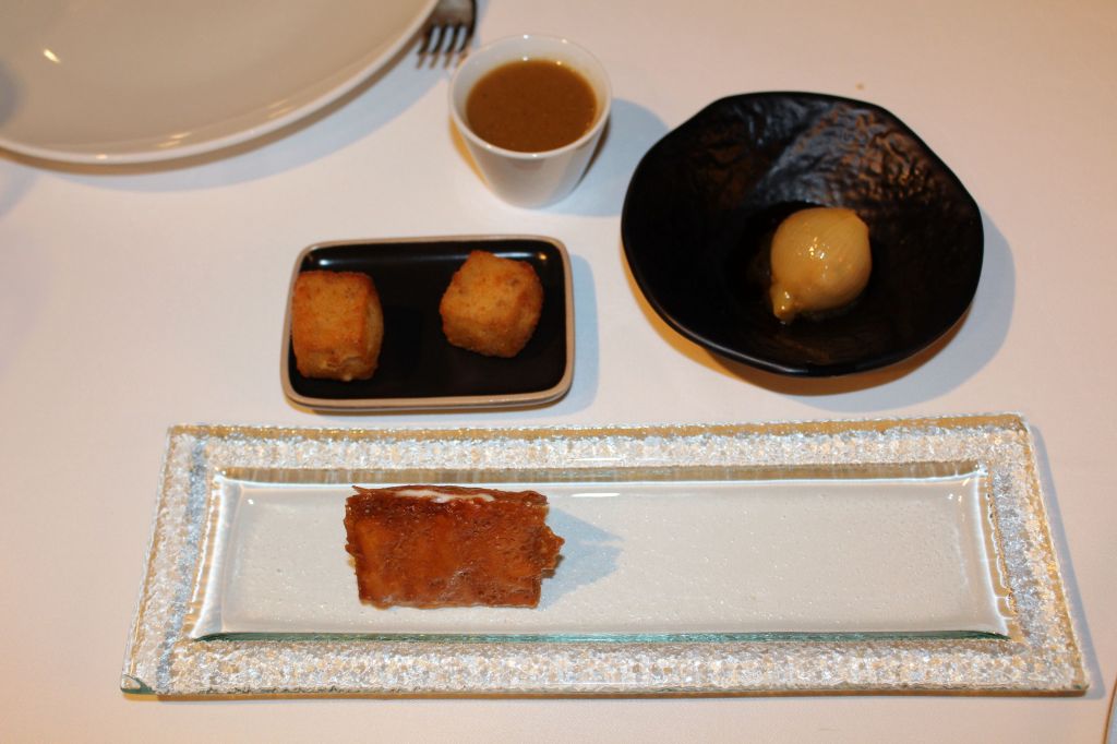 Mi madre se decidió por el plato de aperitivos de la casa, diseñado para comer de forma individual, a saber: el bocadillo crujiente de quesos asturianos, la cebollita rellena de pisto de bonito, el chupito de crema de nécoras y las croquetas del compango de la fabada.