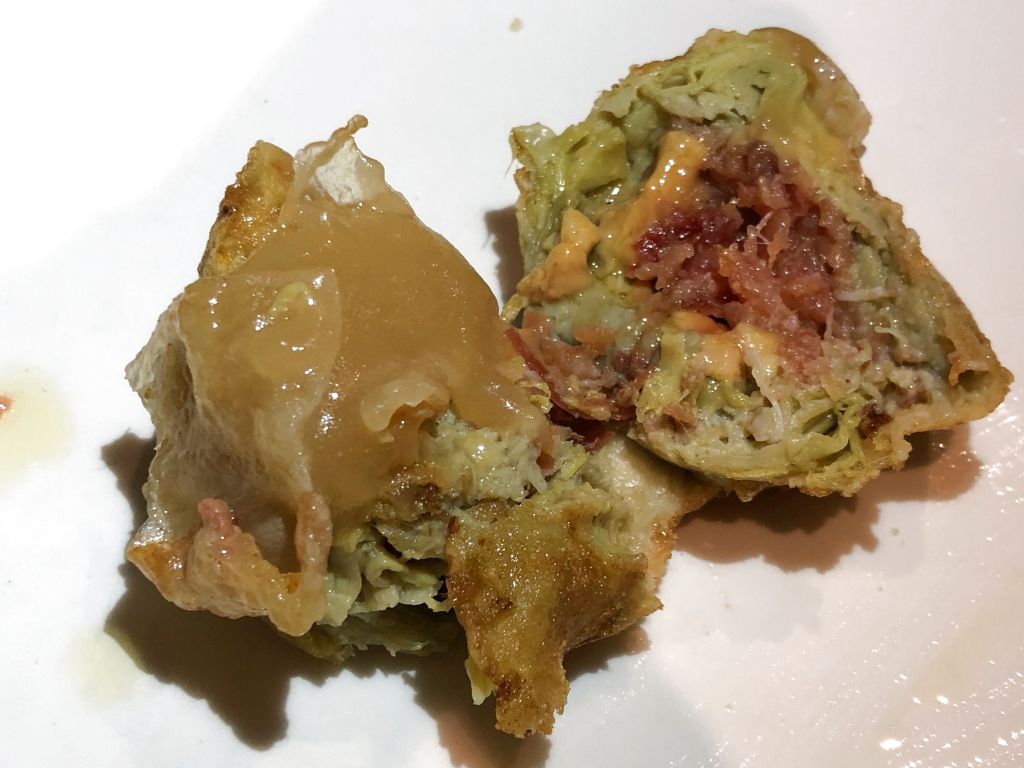 Continuamos con unas alcachofas rellenas de jamón y foie, vienen rebozadas y coronadas con papada ibérica.