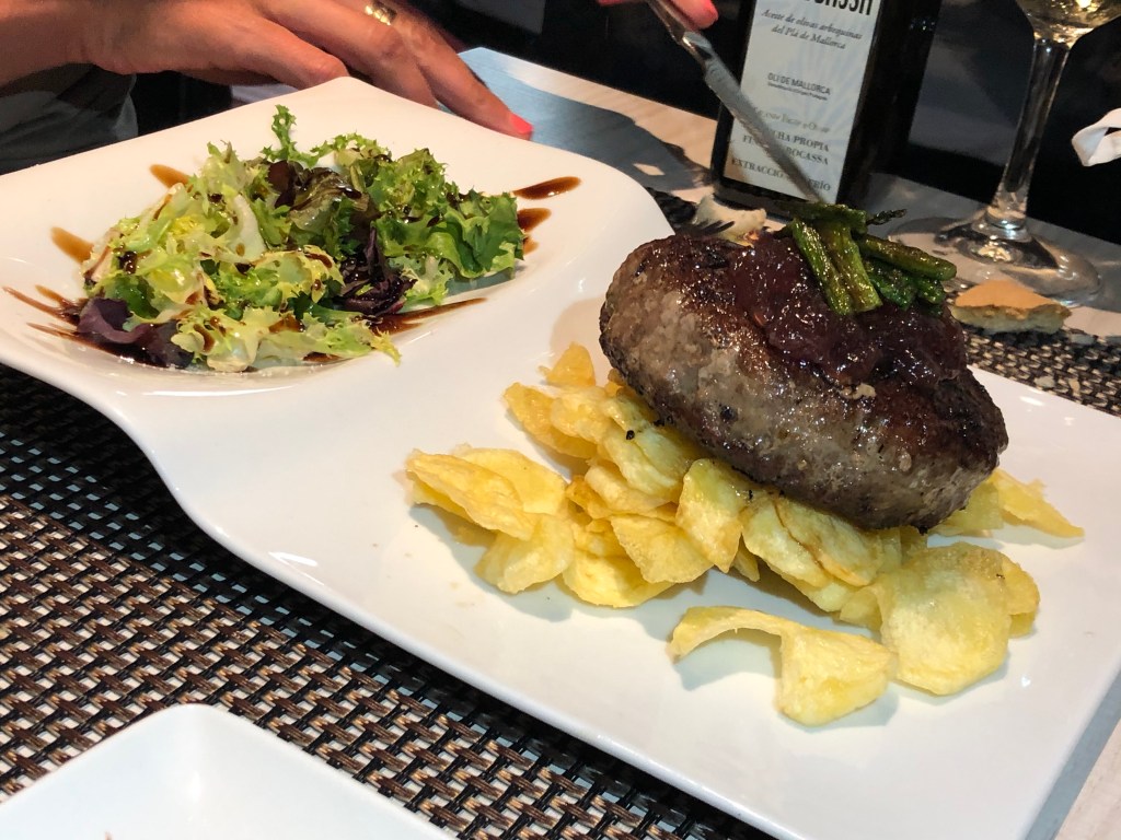 Por último el medallón de wagyu con trigueros y ensalada. En realidad es como una hamburguesa, con la carne picada y creo recordar relleno en su interior con foie y cebolla caramelizada por encima con los trigueros.