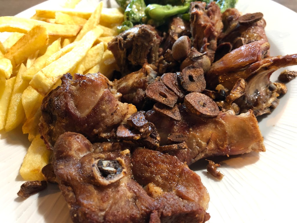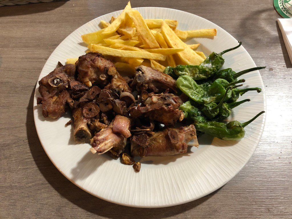 Para la carne era obligado pedir el cabrito frito, viene con mucho ajillo quizás demasiado dorado, unas patatas fritas y unos sorprendentes pimientos del padrón (se cultivan en la isla). Lo esperado y sabido, es una carne un poco recia y con sabor fuerte, estaba muy rico. Con un par de cervezas la cuenta se quedó en 48€, muy pero que muy razonable.