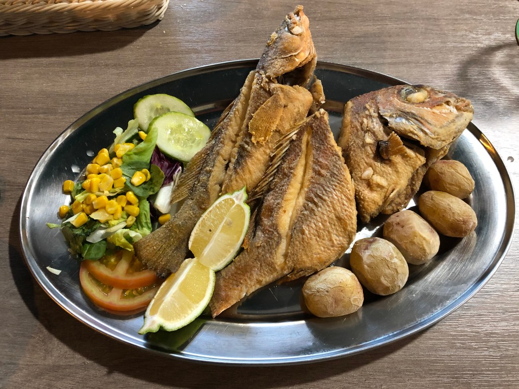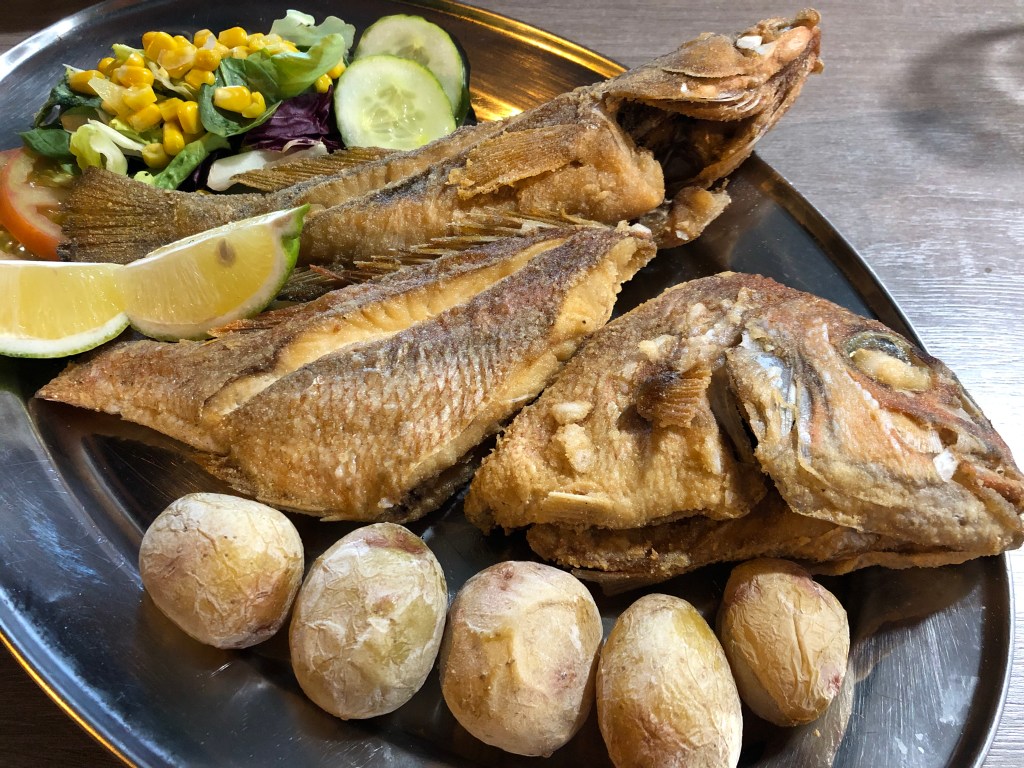 Como platos principales nos animamos con la recomendación del pescado del día, una fritura de Bocinegro y Cabra, acompañados de ensalada y las geniales papas arrugadas con sus mojos rojo y verde servidos a parte. Obviamente no son lubinas o doradas, hemos de ser minuciosos y pacientes con las espinas pero su sabor merece la pena.