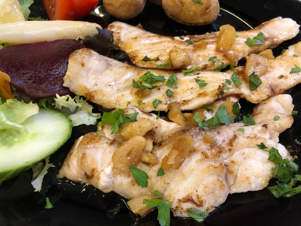 Uno de los pescados del día que nos ofrecieron fue el cherne o vieja, muy típico de la zona, pescado blanco con cierto parecido al mero. Se sirven los filetes al ajillo con una ensalada y las papas arrugás.