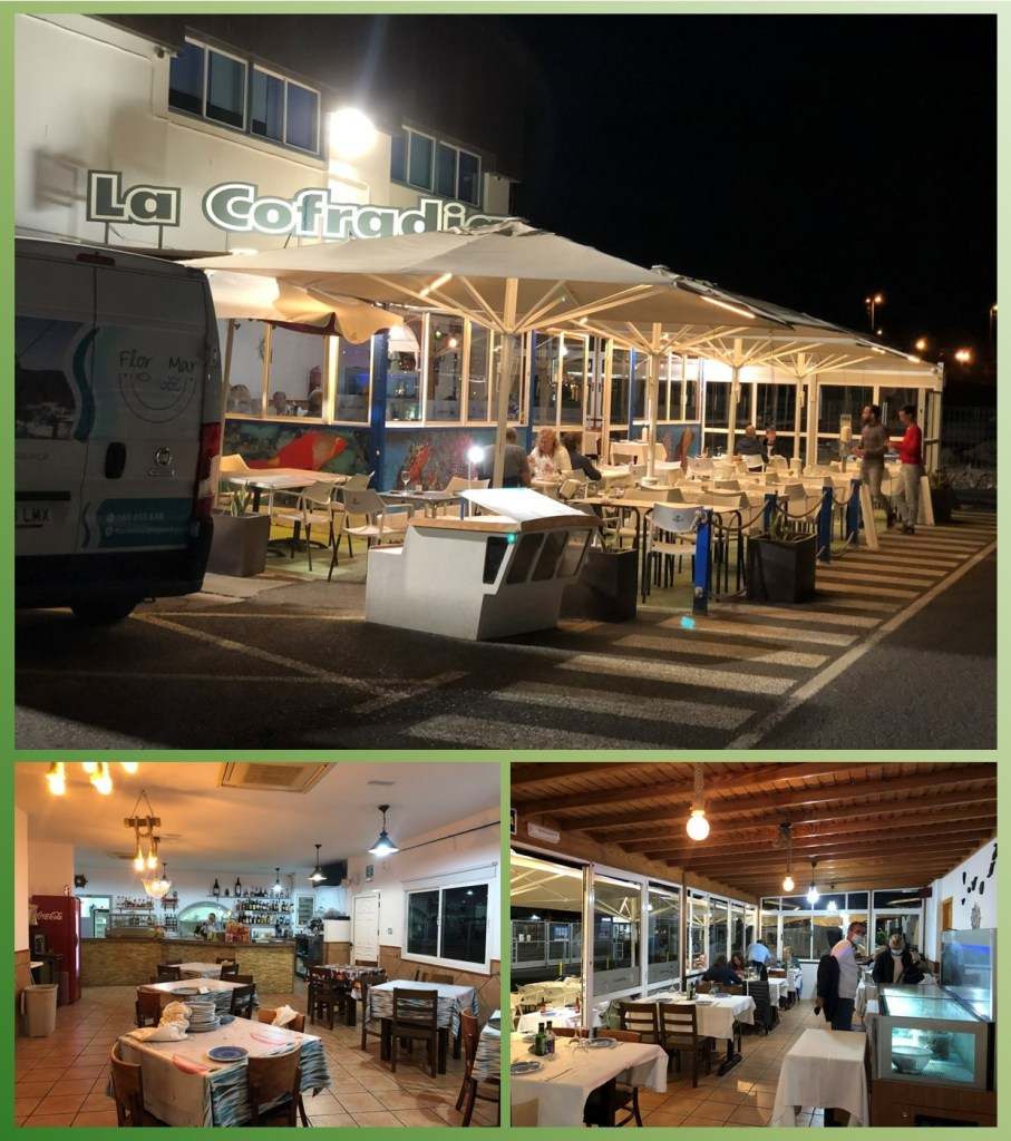 La segunda recomendación es La Cofradía de Playa Blanca que se encuentra al final del paseo, en el puerto marítimo del que salen los ferries. Hay tres zonas de comedor, una interior, una terraza cubierta y la terraza exterior, la cosa está clara, para eso estamos en Canarias y aquí no hacen falta calefactores para estar al aire libre.
