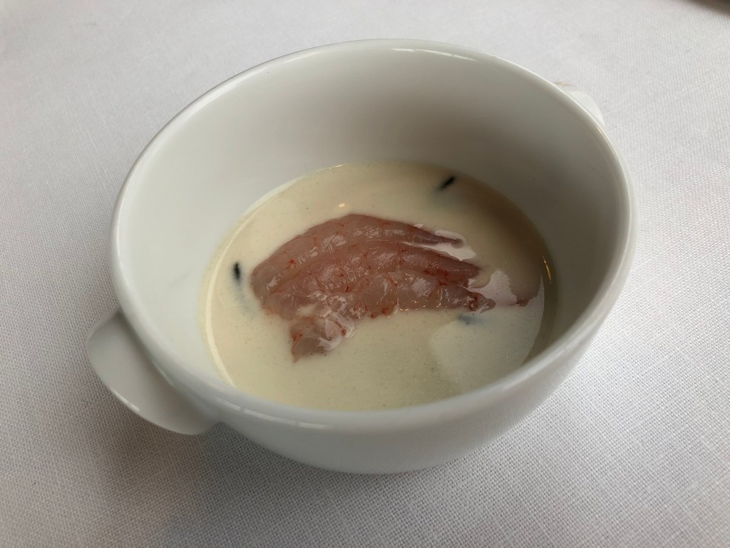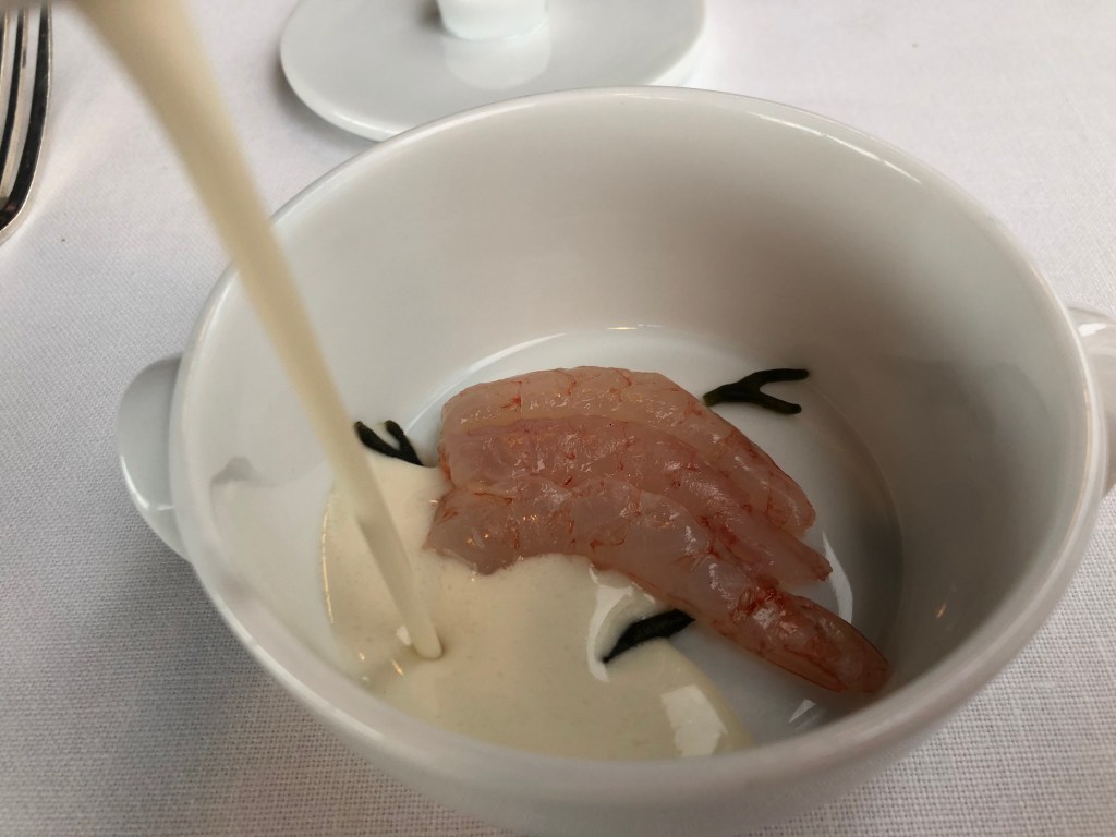 Empieza el propio menú con una crema marina muy sabrosa con la que se riegan unas gambas de Huelva crudas y unos trozos de codium, el calor de la crema es suficiente para dar un leve cocinado a la gamba y respetar toda su esencia.