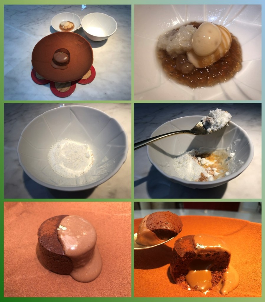 Terminamos con lo que parece un coulant pero nada tiene que ver, es una especie de nube, es una emulsión aireada de cacao origen Venezuela, con un núcleo fundente que lleva un toque spéculoos y con una crema de chocolate con frutos secos. Hasta que no rebañé, no me di cuenta que todo el plato estaba cubierto con cacao y aquí se me encendió la chispa creativa, acababa de caer en la cuenta en que no había organizado ninguna vela y opté por escribir en el chocolate.