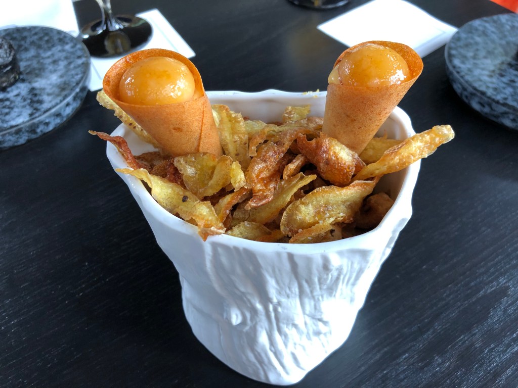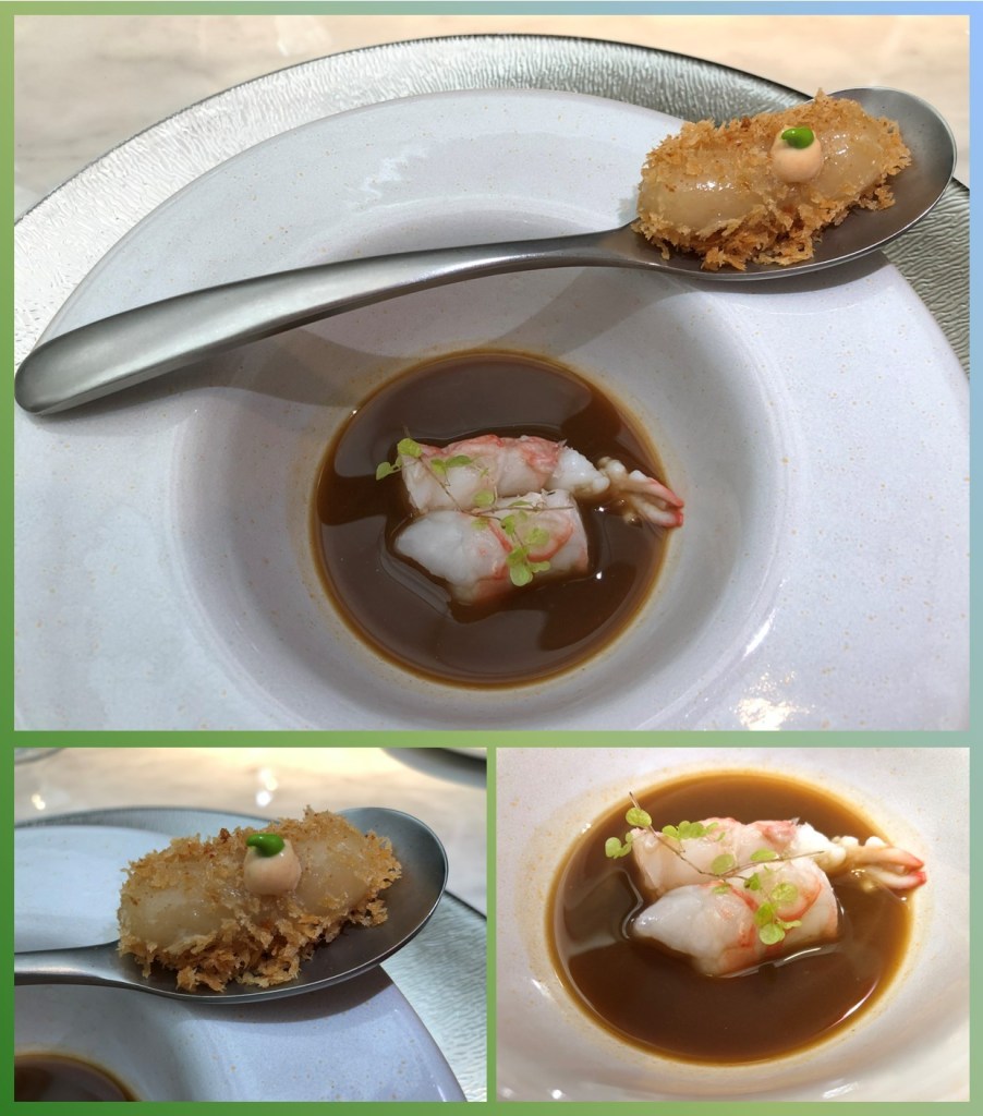 Abandonamos la huerta para sumergirnos en nuestro querido Cantábrico con una marmita de cigala y el ñoqui de sus cabezas. La textura tan fina del ñoqui hace que se tenga que servir en cuchara e imagino que hasta lo disponen con una manga por su delicadeza, la cigala con una textura ideal y esa potencia del caldo convierte a este plato en el mejor representante de la metáfora «comerse el mar a bocados».
