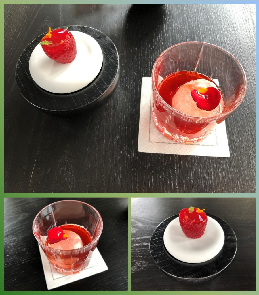 Arrancamos la experiencia con el vermut de fresas, un destilado cántabro de la casa Siderit con el que también hacen un juego de la fresa con vermut, una pieza vaciada y rellena de vermut que decoran con unos acertados aromáticos.