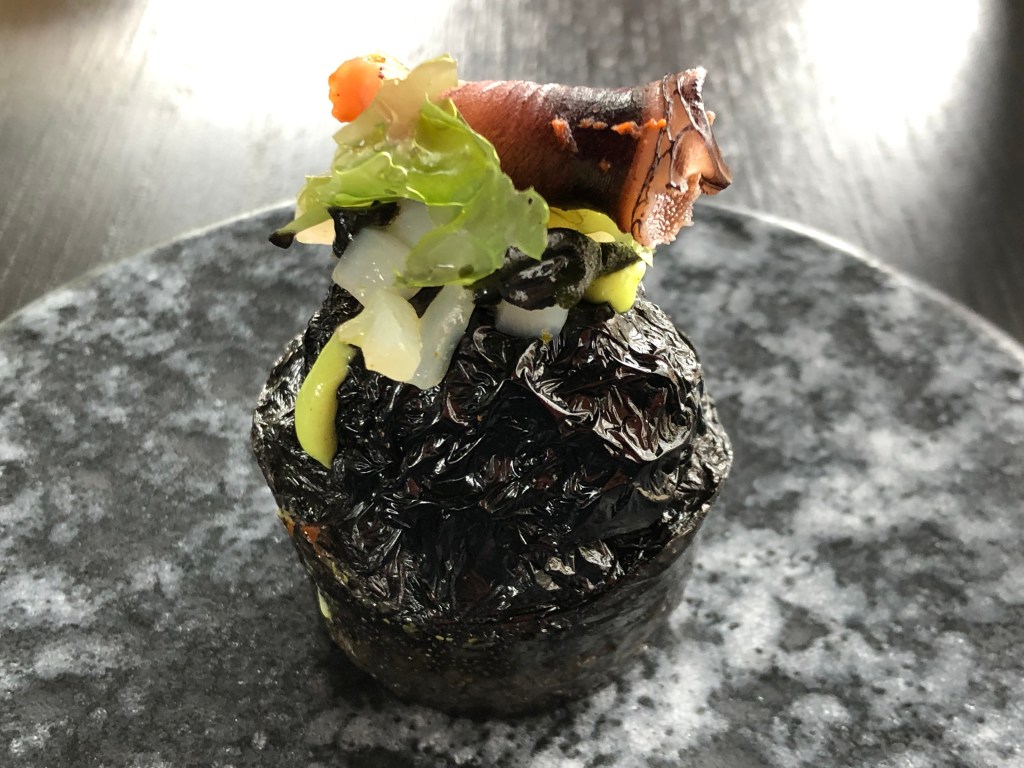 Finalizamos con la etérea roca marina de tinta de calamar con cachón (sepia) y percebe. Tan frágil como deliciosa.