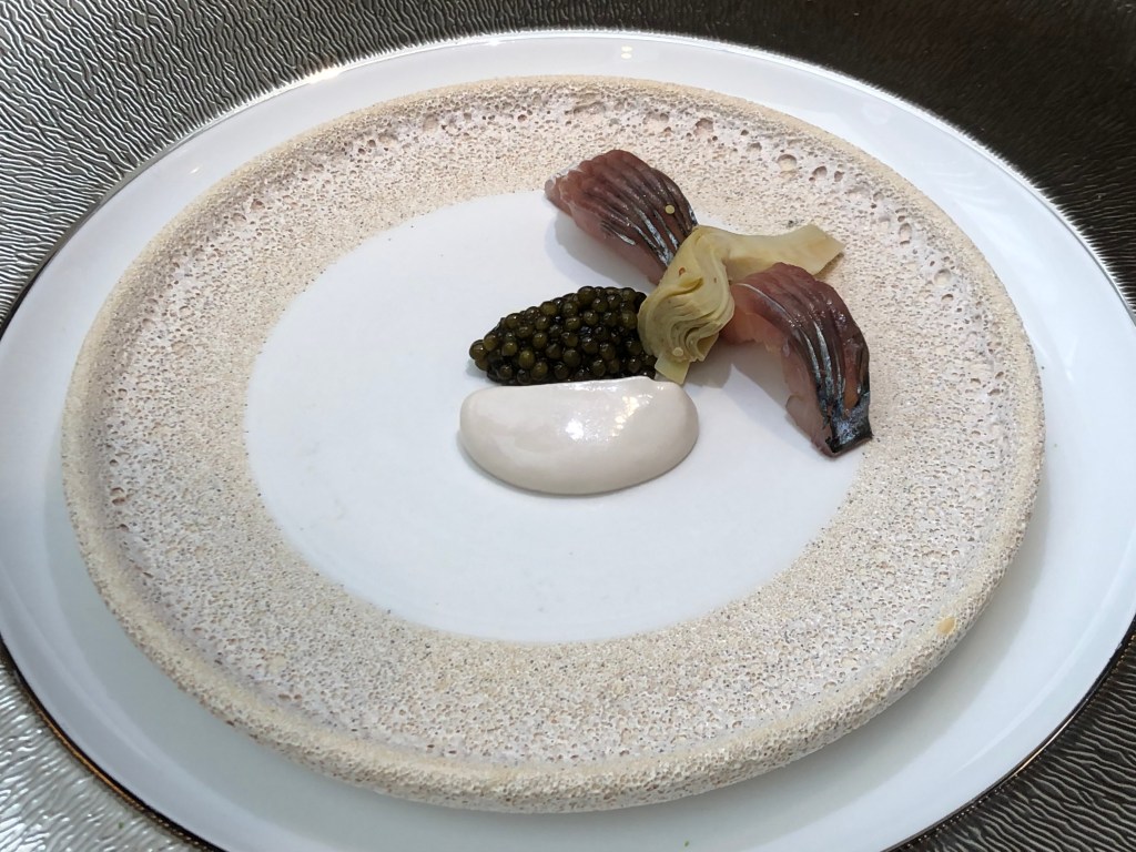 Sirviéndose de una brocheta de plata nos presentan un homenaje a la Gilda, en esta ocasión con un verdel ahumado en frío con sarmiento y en sustitución de la piparra, una alcachofa encurtida con toques anisados, que combinaremos con la emulsión de anchoa y el caviar que nos traen primero en el plato.