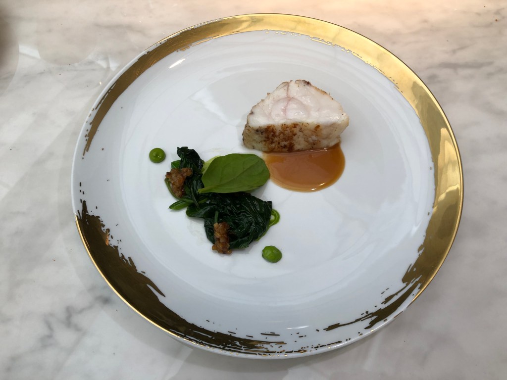 Seguimos con el pastel de merluza con guisante lágrima que en realidad es un taco de merluza del pincho salseado con el pilpil del cogote y los maravillosos guisantes. En un segundo pase nos sirven en el mismo cuenco un caldo hecho con las vainas, removeremos para integrar los restos del pilpil y bebemos directamente como si estuviésemos en casa.