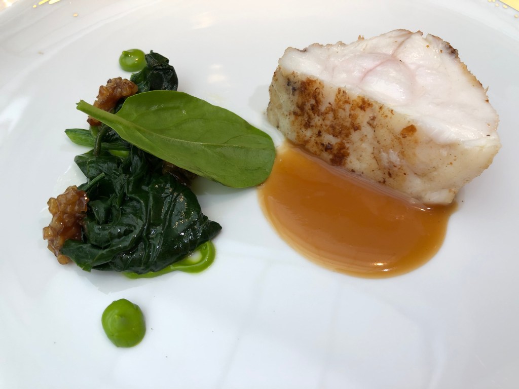 Continuamos con el rape negro del Cantábrico y esencia de las brasas, un buen lomo jugoso con el toque ahumado de las brasas a parte de la salsa concentrada, acompaña de un refrito de espinacas y la versión moderna de la guarnición de patata panadera y cebolla.