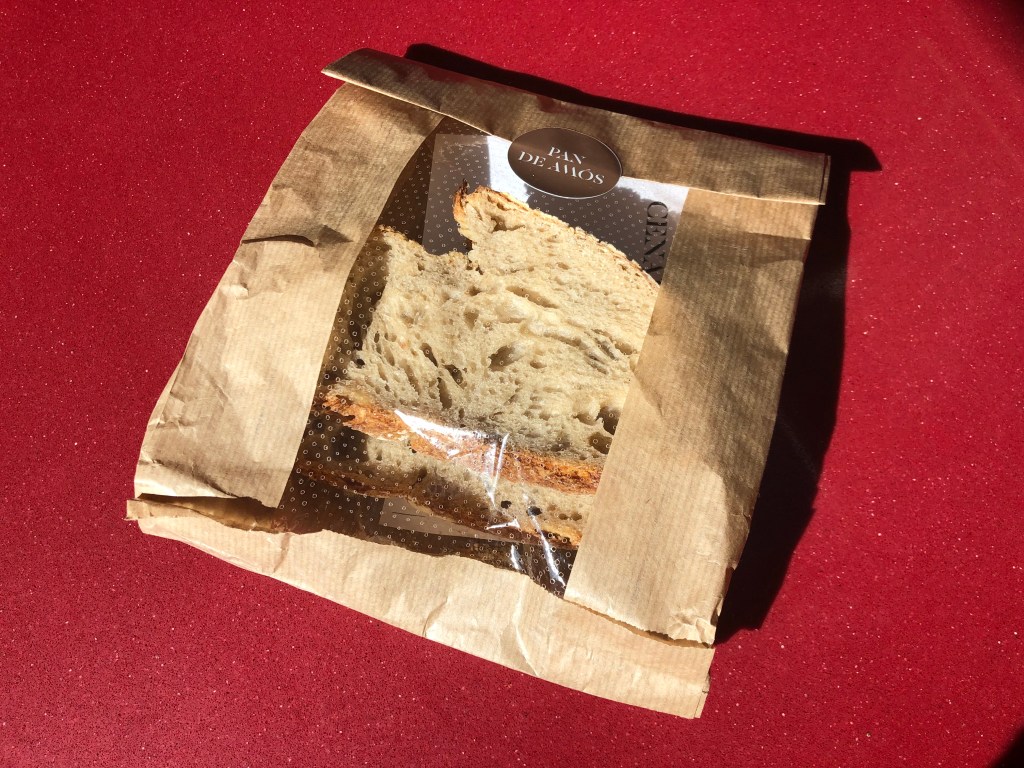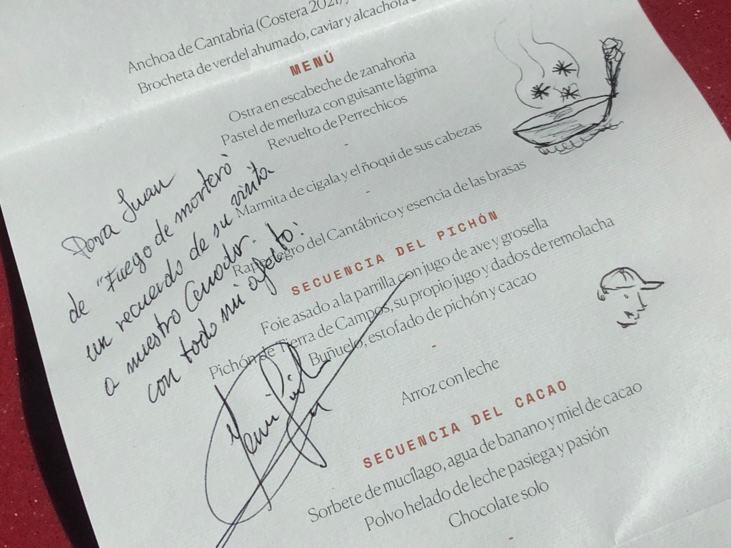 La experiencia llegaba a su fin y con la cuenta nos entregaron el menú Temporalidad impreso. Algo que me gusta conservar para mi álbum de recuerdos, son los menús dedicados y a la par que lo firmaba pude cambiar impresiones con Jesús y Marian sobre diversos temas culinarios. Además al despedirnos nos obsequiaron con unas rebanadas de pan de Amós de las que dimos buena cuenta al día siguiente.