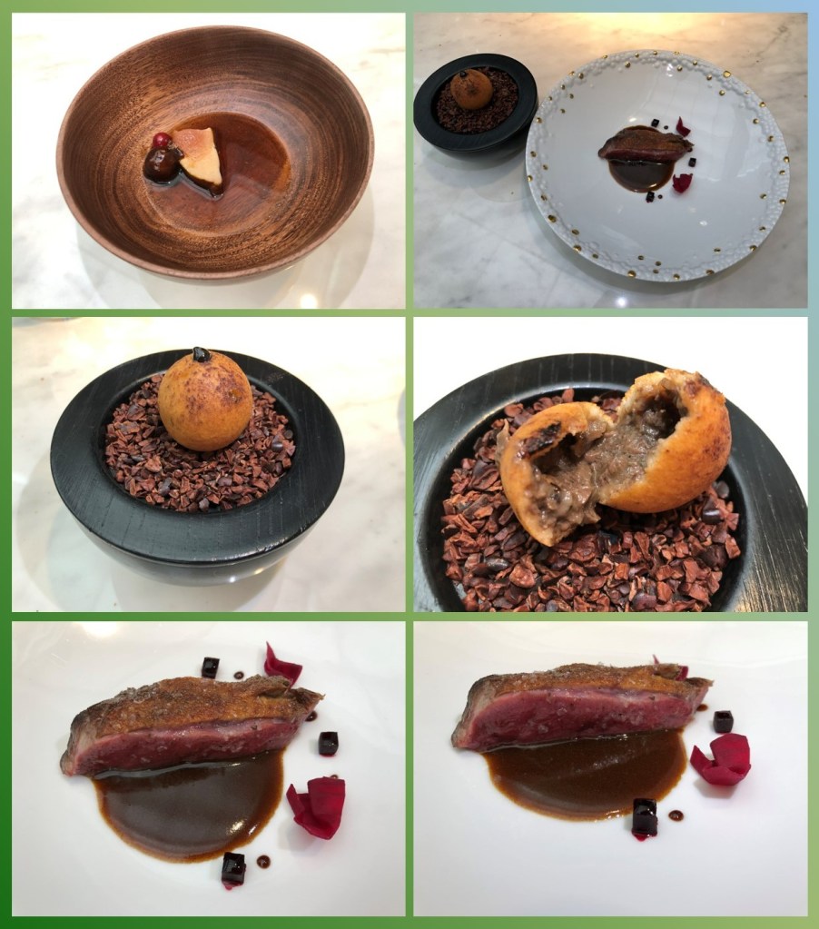 Uno de los productos fetiche de la casa es el pichón y para esta temporada nos lo presenta en la siguiente secuencia: primero, un foie de pato asado a la parrilla acompañado de una espuma de chocolate, una albóndiga de pichón, el contraste acido de la grosella y finalizado in situ con un consomé de pichón.