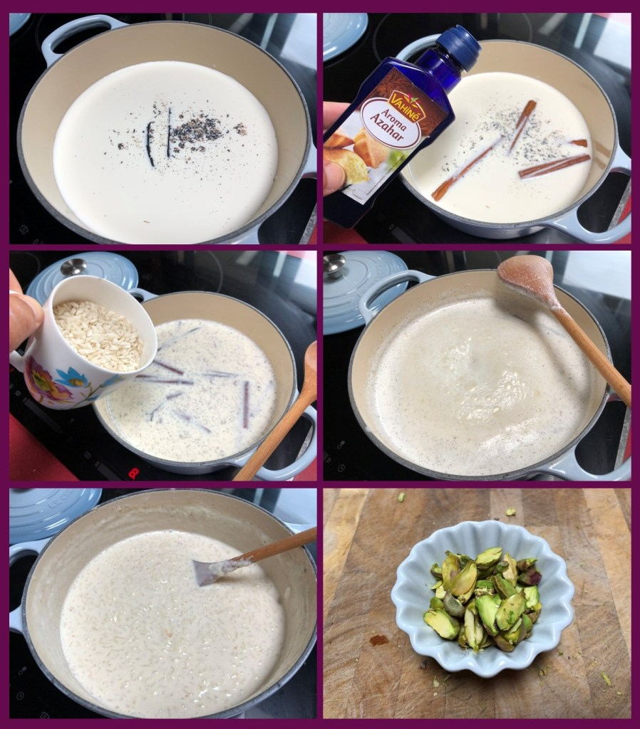 Comenzaremos mezclando la leche y la nata, cortamos la vainilla y extraemos las semillas que junto a la rama incorporamos al líquido. Partimos las ramas de canela, ponemos el azúcar y el agua de azahar para infusionar durante unos cinco minutos a fuego medio, luego subimos a medio alto y añadimos el arroz que removeremos frecuentemente durante unos veinte minutos.