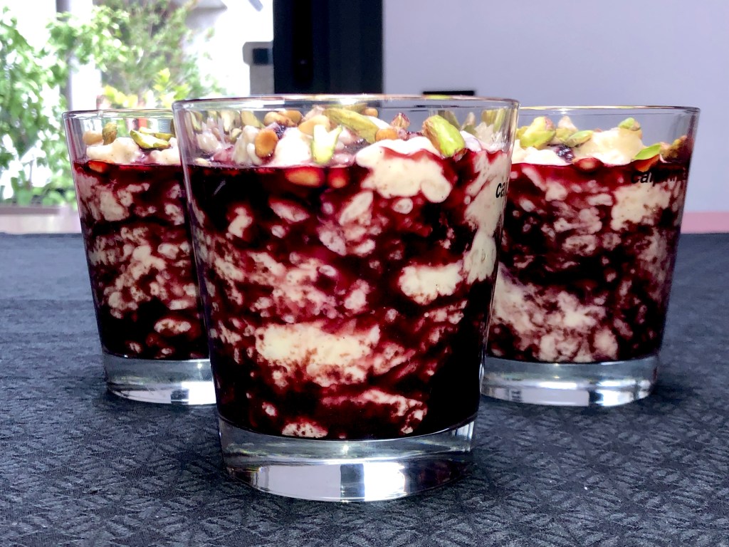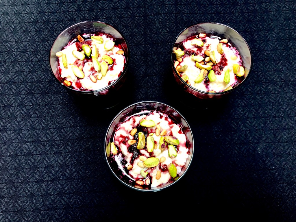 Mientras, pelaremos los pistachos y partiremos a la mitad, tostamos los piñones y cuando este el arroz y compota listo montamos el postre en unas copas o recipientes transparentes. La idea es que se vea el contraste de colores, así comenzamos con una capa de cerezas, luego el arroz y así sucesivamente, rematamos con los frutos secos y consumimos en caliente.