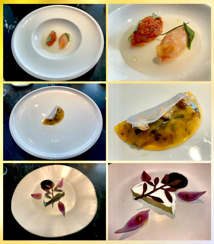 Pasamos a los ENTRANTES con el Tartar de tomate de temporada a modo de steak, gamba roja de Águilas y halófilas, aliñan y secan los tomates para picarlos a modo de steak tartar de solomillo de ternera. Las gambas van en crudo aderezadas con limón murciano que ahora se encuentra en cambio de ciclo y lo utilizan verde, también va el agua de tomate y las diferentes plantas halófilas.
