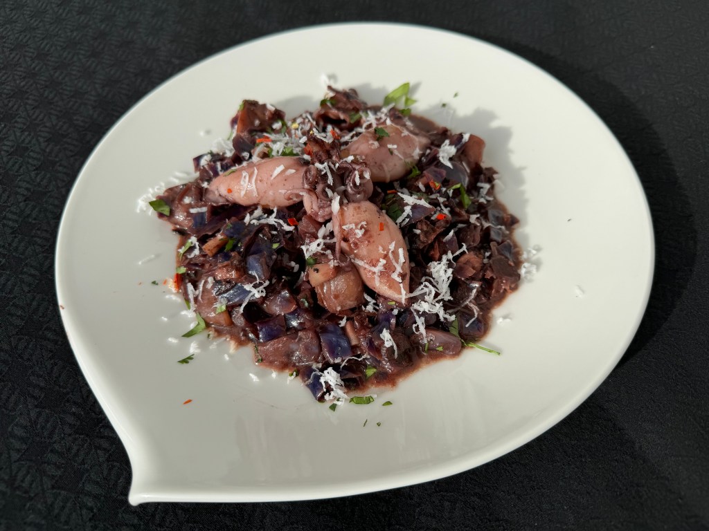 Juntar las verduras con el marisco y pescado es un matrimonio perfecto, aquí además se me ocurrió aunar por colores, el morado de la lombarda, el de la cebolla y el tono que coge la piel de estos chipirones (podría ser pulpo o sepia). Por supuesto podemos jugar con otras verduras como el repollo, cardo..etc, esas que tienen cierta consistencia y sin hacerse en exceso mantienen un punto crujiente; y aparte de los cefalópodos unos simples mejillones, langostinos, unos dados de rape, cazón, mero…etc (pescados prietos).
