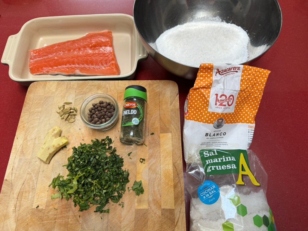 Para el salmón curado: 1 cola de salmón fresco, 500grs de sal gorda marina, 500grs de azúcar blanquilla, 1 trozo de jengibre fresco, Cilantro fresco, eneldo (mejor fresco), cardamomo y pimienta de Jamaica.