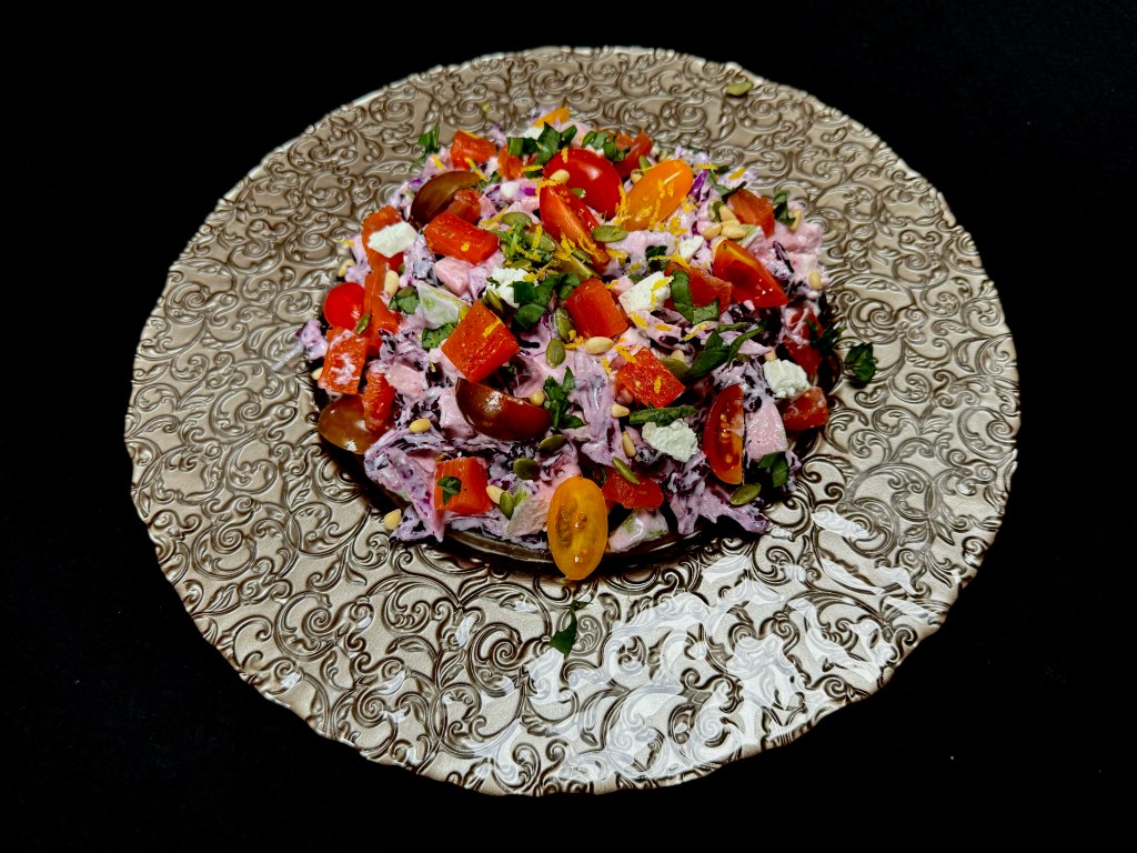 Para la ensalada: 1/4 de lombarda, salmón curado, 1 manzana granny smith, queso feta, 1 yogur griego, 1 limón, tomates cherry, albahaca fresca, pimienta de Jamaica, semillas de comino, piñones, pipas de calabaza, uvas pasas, sal y AOVE.