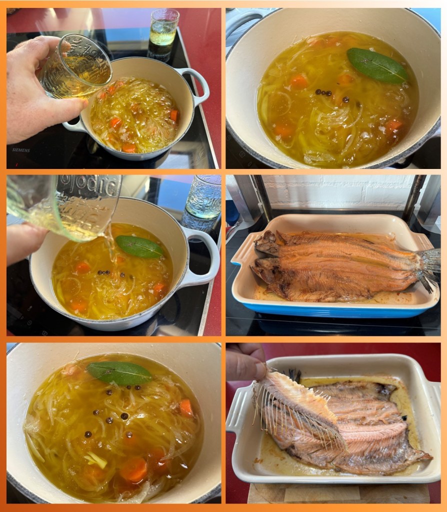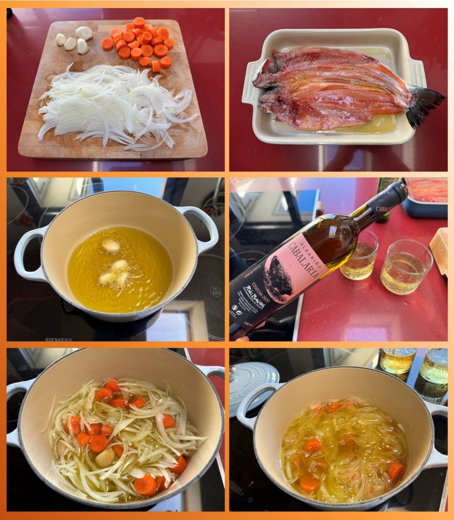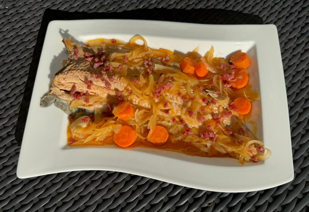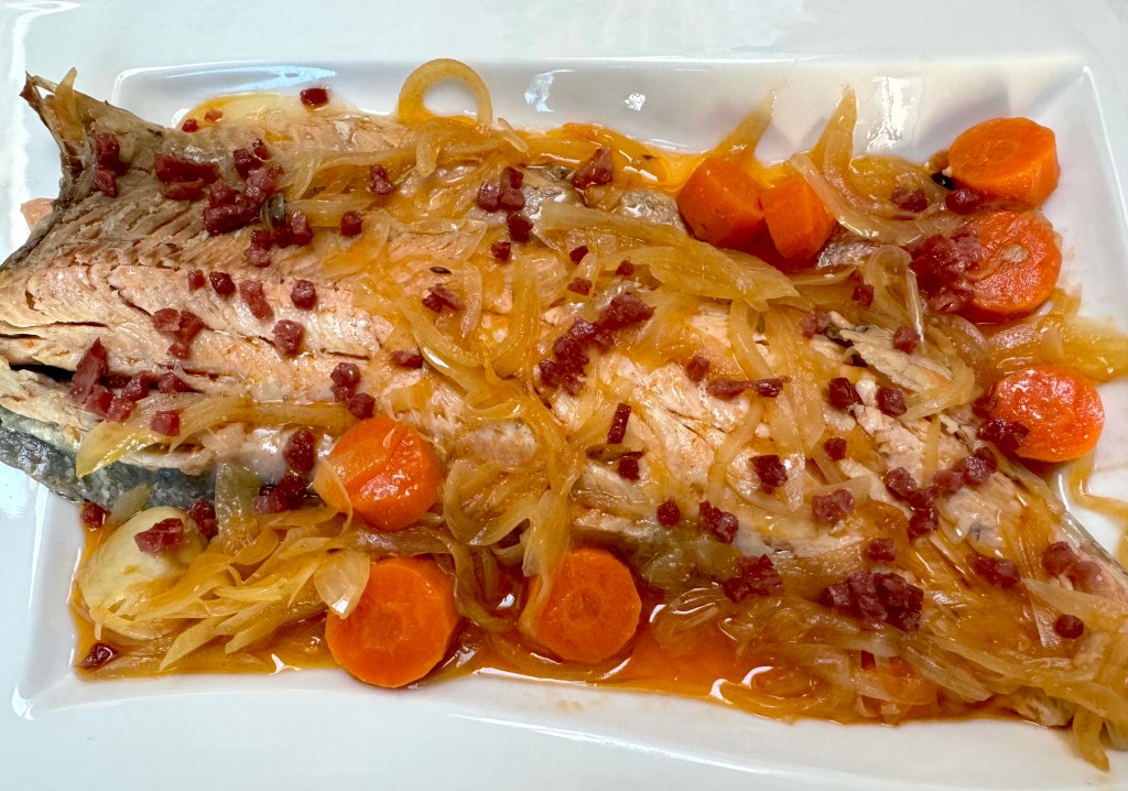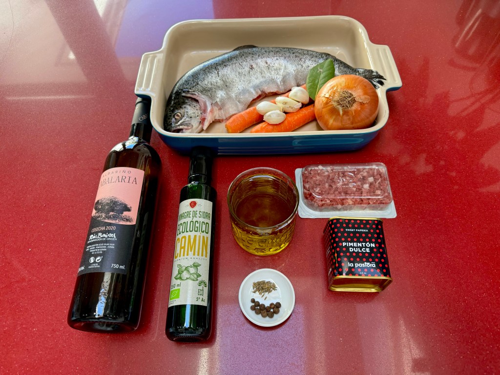 1 trucha (1kg), 1 vaso de AOVE, 1/2 vaso de vinagre de manzana, 1/2 vaso de vino (blanco) albariño, 4 dientes de ajo, 1 cebolla, 2 zanahorias, pimienta negra (de Jamaica), 1 hoja de laurel, semillas de comino, 1cta de pimentón dulce o picante, tacos de jamón y dos pizcas de sal.