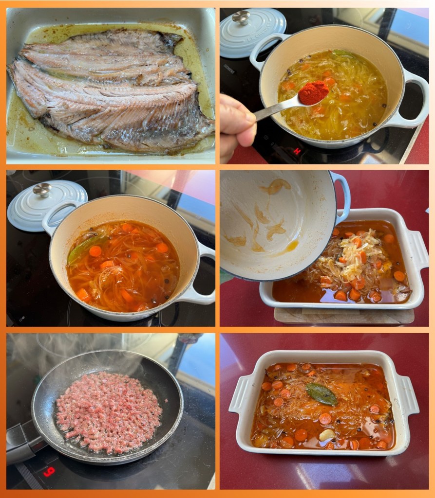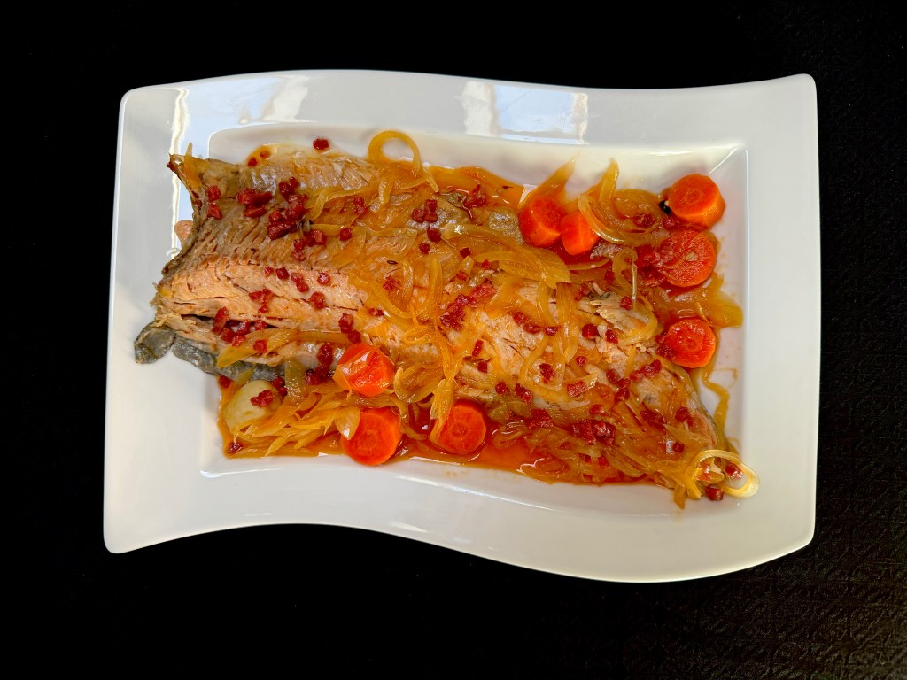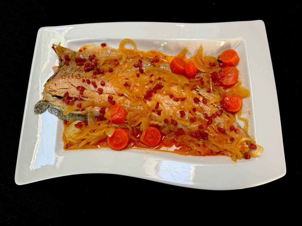 Mientras aprovechamos para quitar la cabeza y cola, tiramos con cuidado y sale la espina central arrastrando la mayoría de espinas, con unas pinzas procuramos quitar las que queden y mantenemos en el horno caliente pero apagado. Cuando se termine el escabeche, con el fuego apagado incorporamos el pimentón y mezclamos, volcamos sobre la trucha, repartimos la verdura y conservamos 24horas en la nevera.