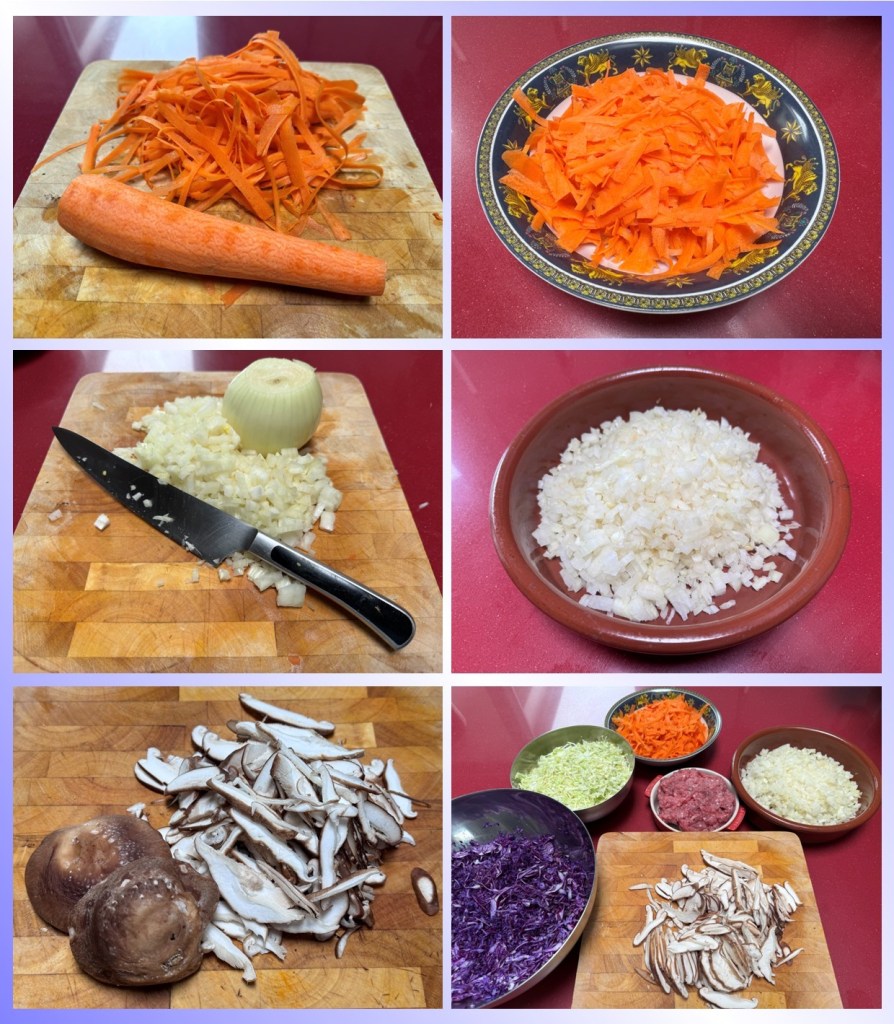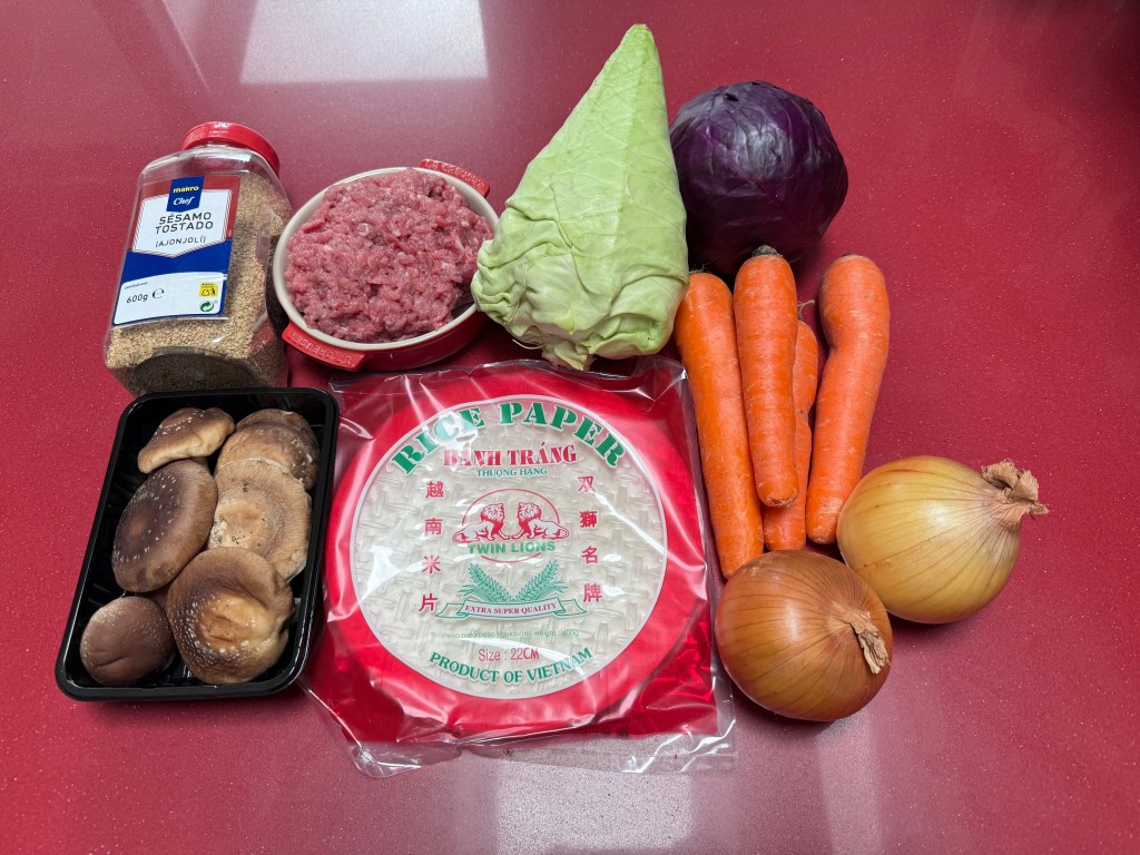 Papel de arroz 22cm, 500grs de ternera asturiana, 1 repollo picudo, 1 lombarda, 2 cebollas, 3 zanahorias XL, setas shiitake, sésamo tostado, aceite de girasol, sal y agua.