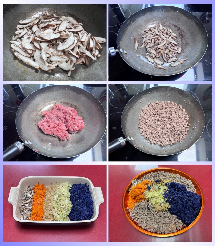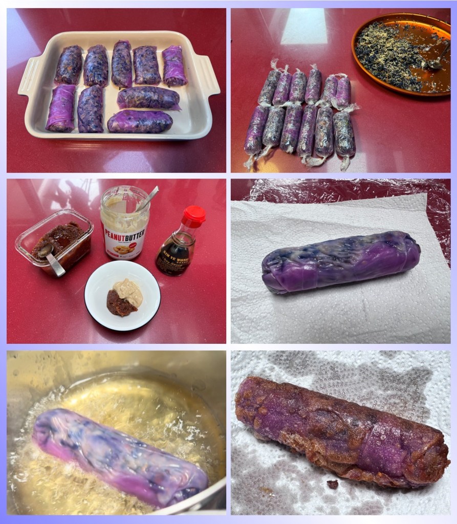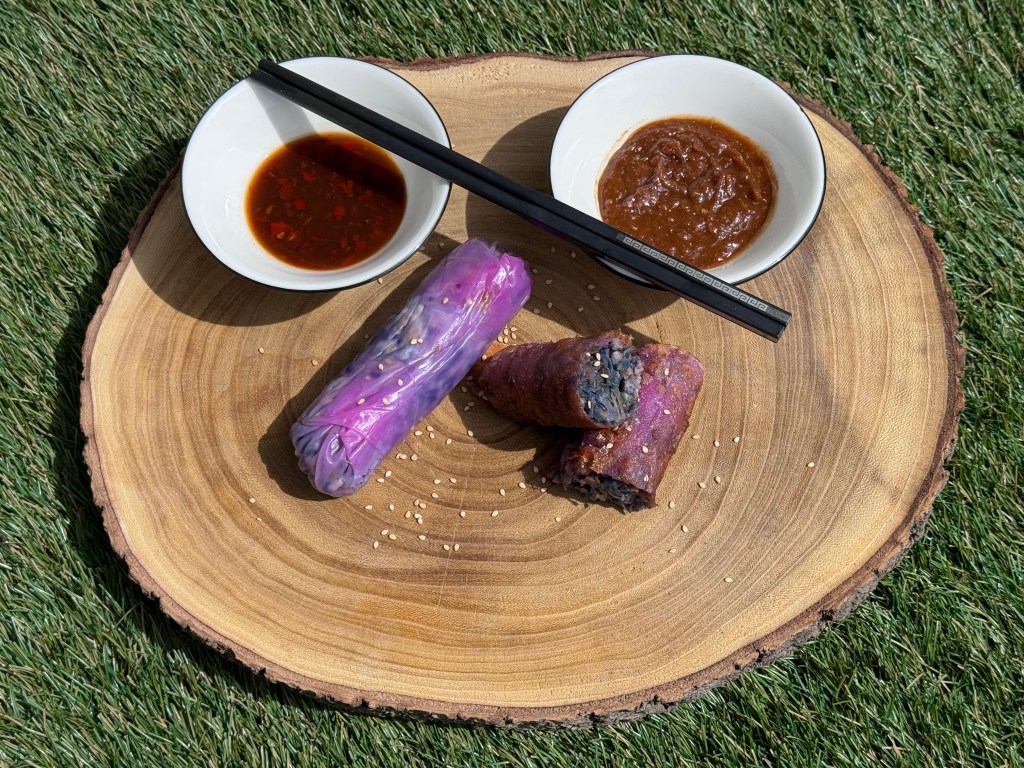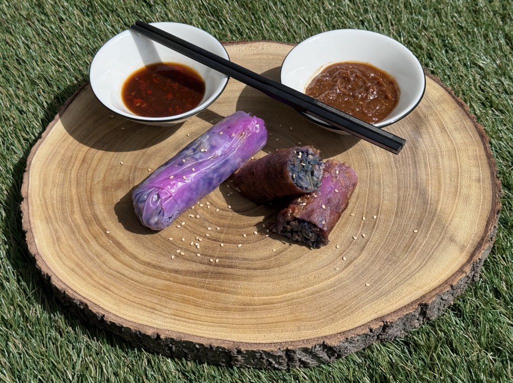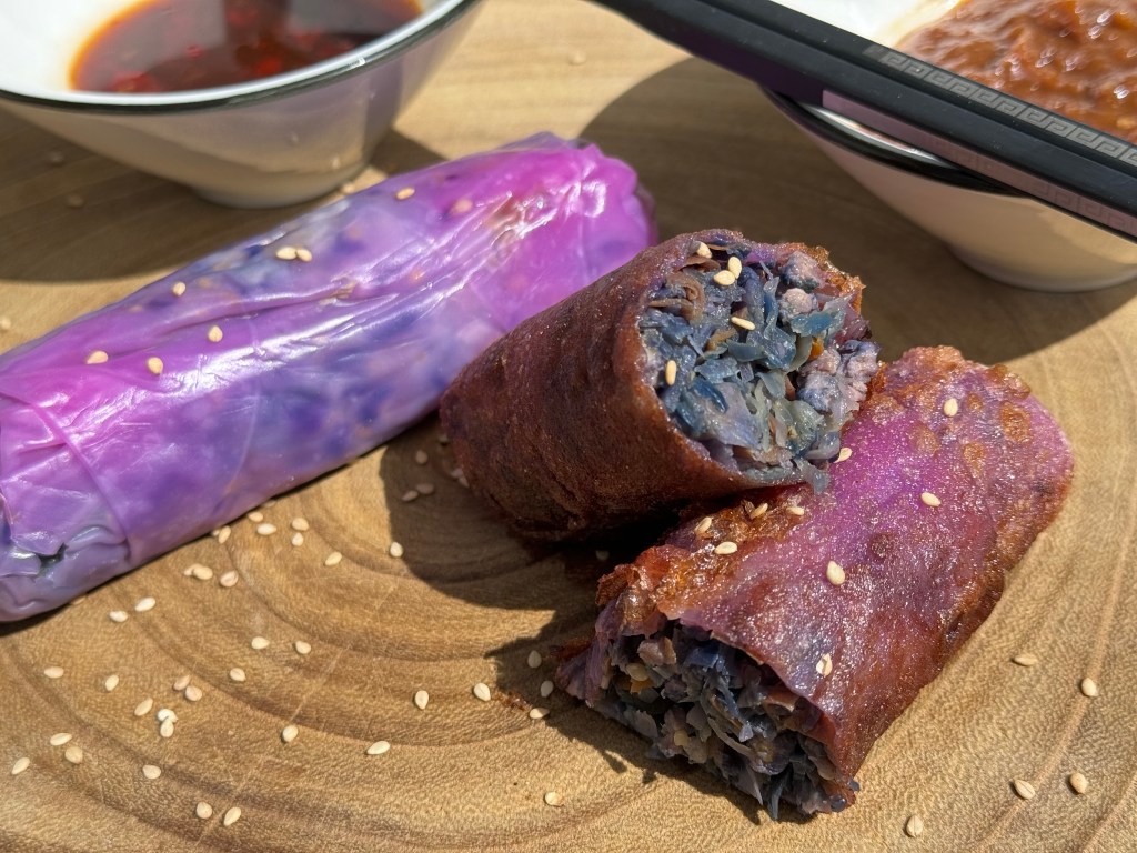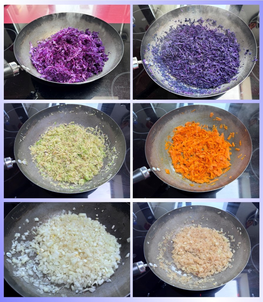 En mi versión he utilizado carne de ternera, soy asturiano y una buena ternera asturiana solo podría ser igualada por un gochu asturcelta. Dentro de las verduras habituales de los rollitos esta la col china y los brotes de soja, yo me he animado con un repollo picudo y sobremodo la lombarda que si bien en su interior pierde la potencia de color, remojar las hojas de arroz en el agua les ha dado un color morado muy divertido y diferente. La zanahoria, cebolla y unas setas shiitake son el resto de ingredientes que han sido salteados por separado en un un wok.