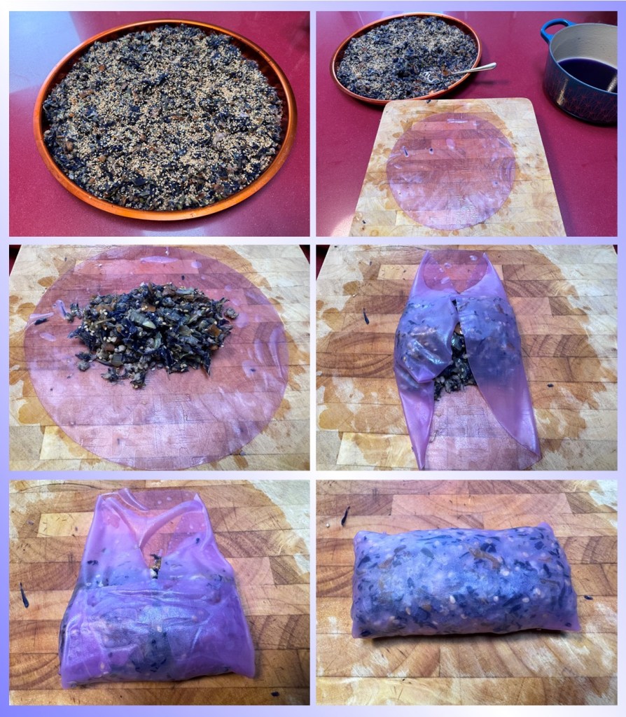 Cuando este todo a temperatura ambiente añadimos el sésamo y comenzamos a montar los rollitos. Sumergimos cada papel de arroz en el agua de lombarda durante unos 15 segundos. Lo estiramos sobre la tabla de madera o en la encimera, colocamos dos buenas cucharadas o tres de relleno en el centro y lo cerramos llevando los laterales al centro (las 3 y las 9 de un reloj), luego vamos a las 6 y enrollamos apretando hacia las 12 con la que deberemos cerrar nuestro rollito.
