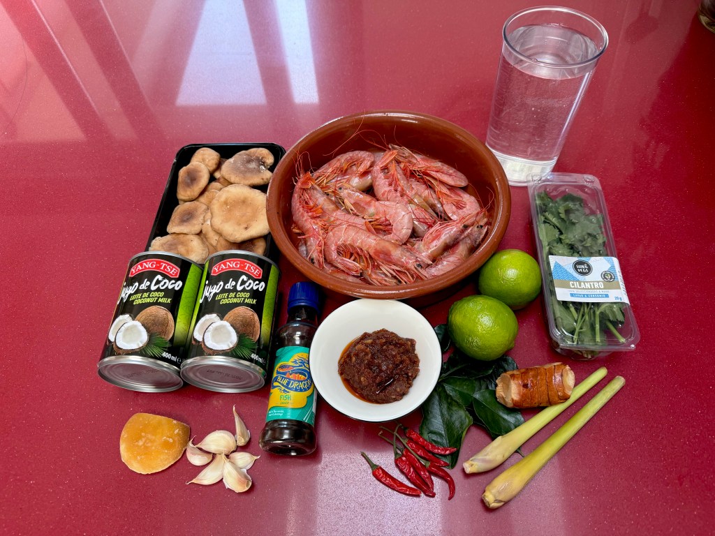 18 langostinos, 200grs de setas shiitake, 800ml de agua, 400ml de leche de coco (2 botes), 2 limas, 6 chiles thai secos), 2 bastones de Lemongrass, 1 trozo grande de galanga, 8 hojas de lima kaffir, 6 dientes de ajo, 2 Cdas. de pasta de chili «nam prik pao», 1 Cda de azúcar de palma, 3 Cdas. de salsa de pescado, 1 manojo de cilantro fresco, 1 Cda de aceite de girasol, sal.
